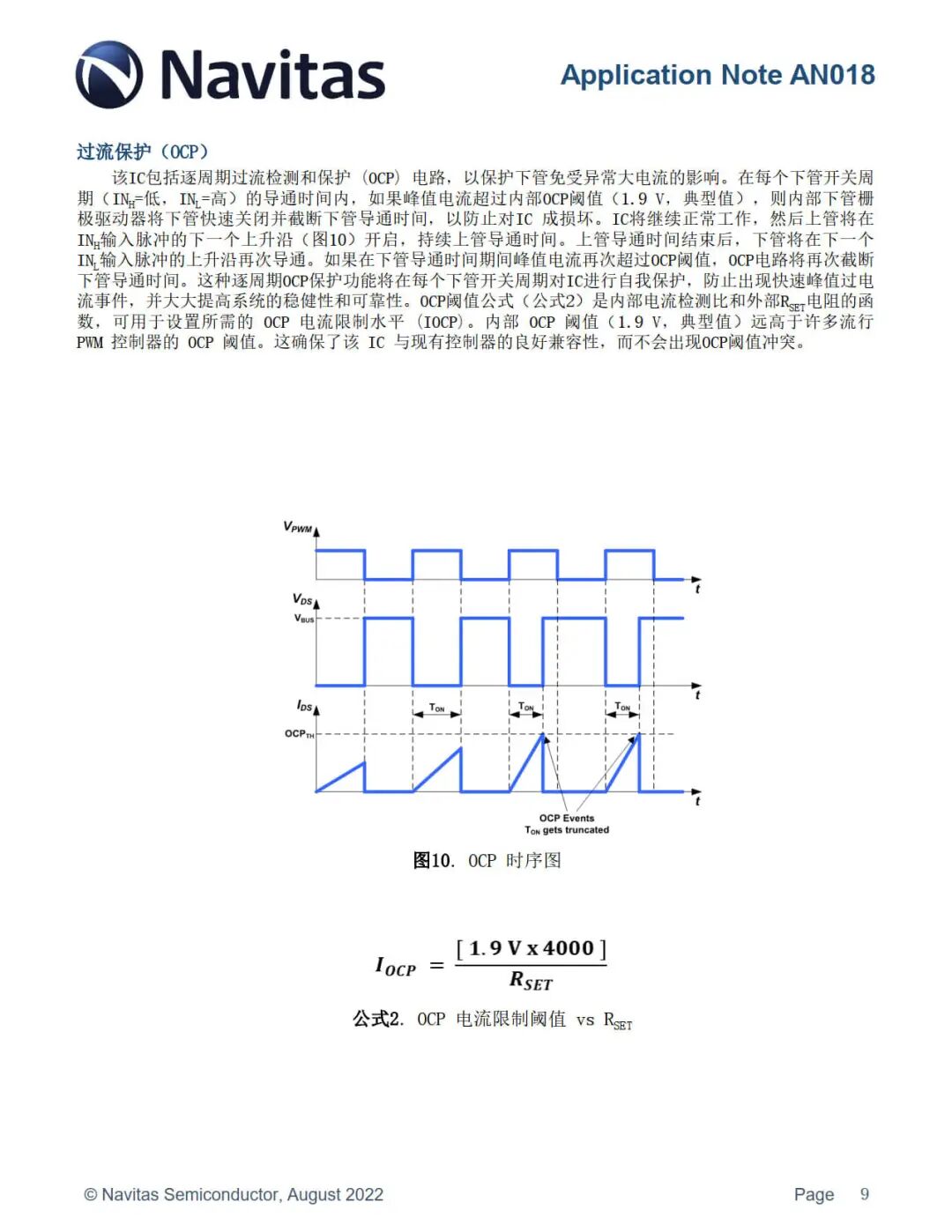 纳微 NV624x 包括逐周期过流检测和保护 (OCP) 电路,以保护下管免受异常大电流的影响。在每个下管开关周期(INH=低,INL=高)的导通时间内,如果峰值电流超过内部 OCP 阈值(1.9 V,典型值),则内部下管栅极驱动器将下管快速关闭并截断下管导通时间,以防止对 IC 成损坏。