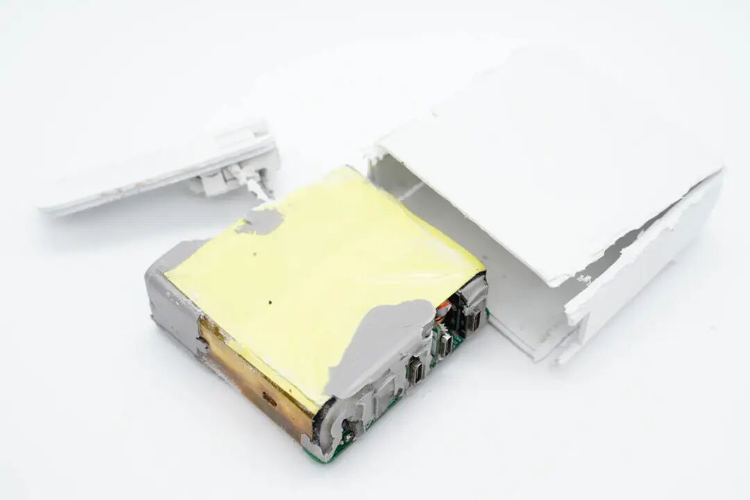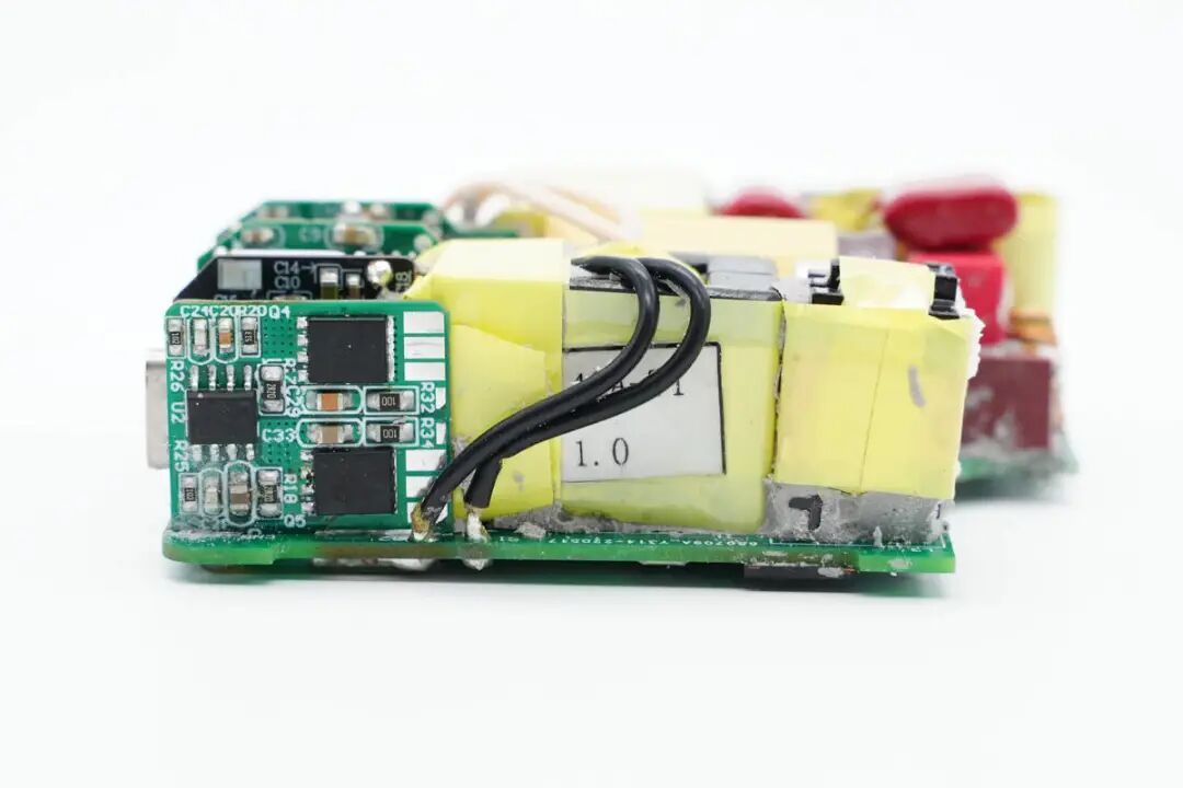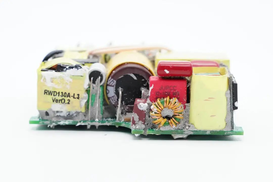 将输入端外壳拆开,充电器内部整体灌胶增强散热和提供整体耐候性。