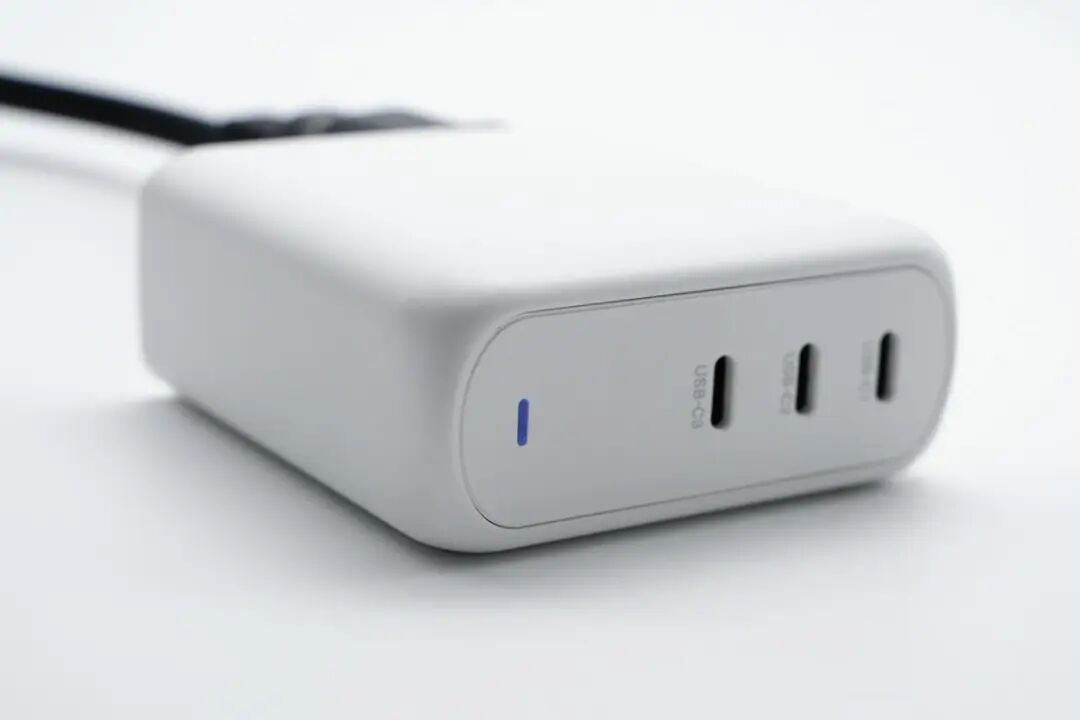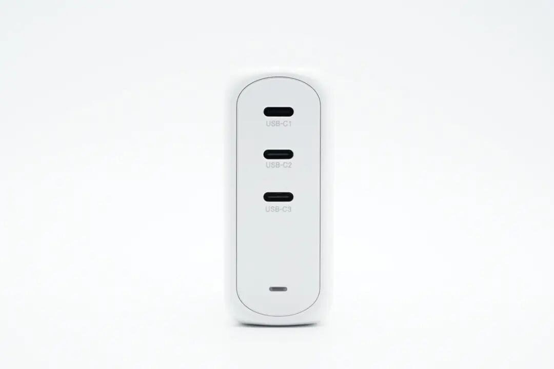 输出端设有LED指示灯以及三个USB-C接口,接口旁有标序,方便用户区别使用。