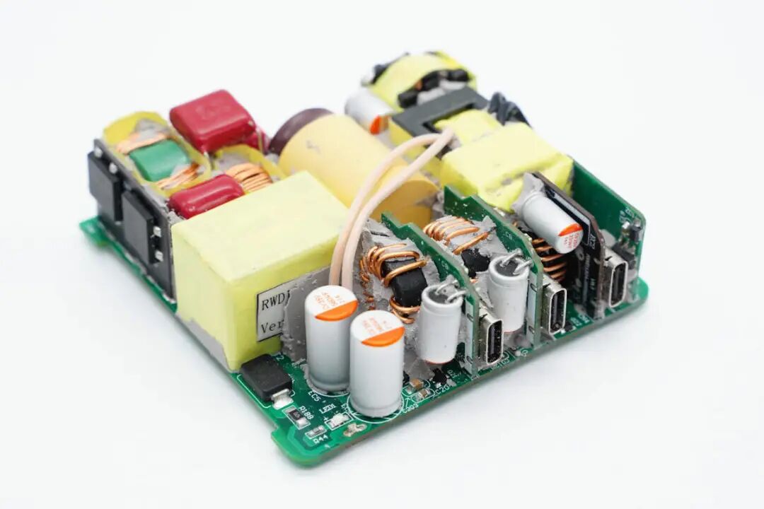PCBA模块正面一览,主板左下角设有输入EMI滤波器件,中间横置高压滤波电解电容,上方是谐振电感和变压器,右侧三个USB-C母座均焊接在小板上。