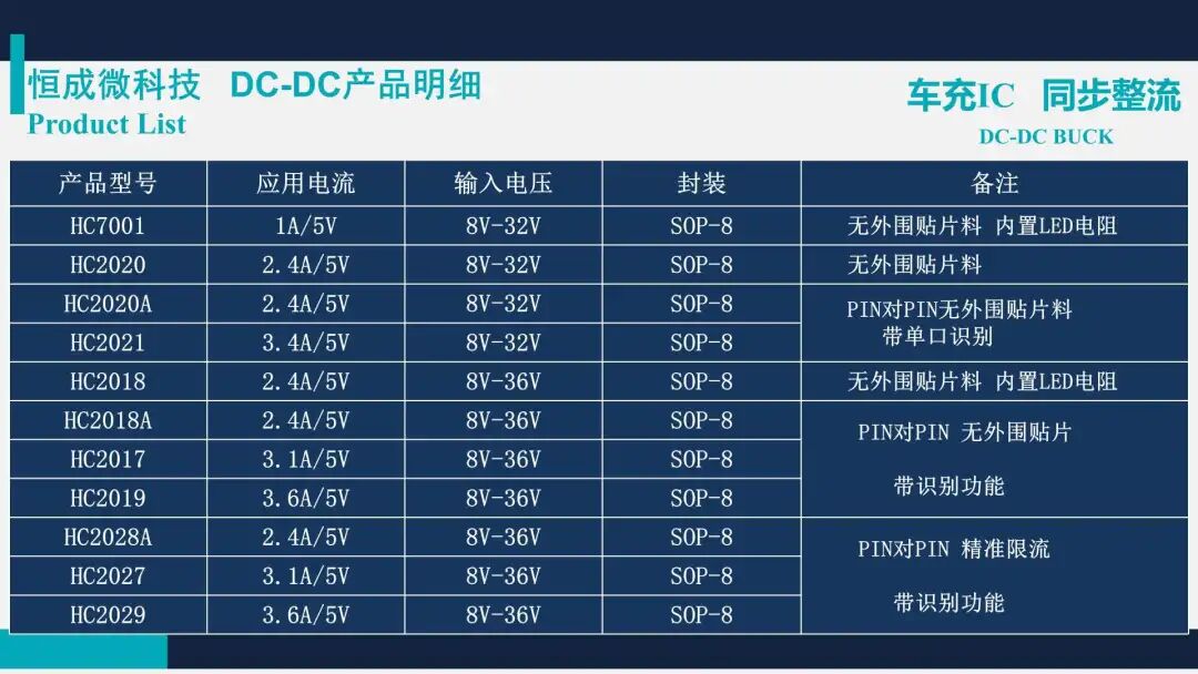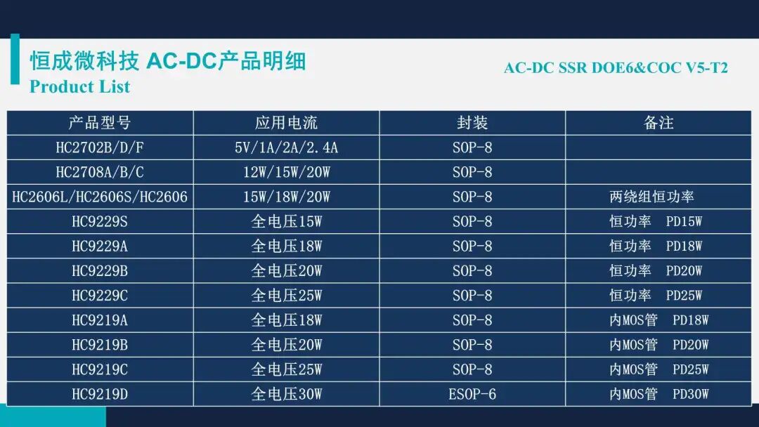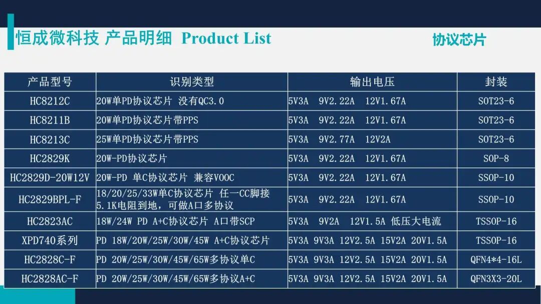 随着大屏手机和5G技术的普及,快速充电技术也越来越受到人们的关注。可能大家也有注意到,在近年来的很多大牌手机发布会中,快充技术甚至被当成了产品的核心竞争力大讲特讲,与以往只是对充电性能一带而过形成了鲜明对比。同时也足以见得,如今的快充技术对于产品的重要性。深圳市恒成微科技有限公司是一家专注于高性能、高品质的集成电路芯片研发、生产、销售的高科技企业,其优秀的设计团队来自世界知名大型IC设计公司,拥有10年以上先进的车充芯片、旅充芯片的设计、生产和测试技术经验。恒成微主要以电源管理芯片与方案为主要研发营销方向,致力于为客户提供更高性能、更低BOM的解决方案,逐步成为电源的标杆方案。产品主要覆盖电源管理(DC-DC、AC-DC、快充IC、PD协议IC)等领域,主要针对各类电子产品的电源应用开发。恒成微秉承为客户提供优质服务和业界最高性价比解决方法的理念,励志成为国际一流的电源管理IC设计企业。恒成微 HC20XX 系列产品支持 2.4~3.6A 应用电流,输入电压最高支持 8~36V,均采用 SOP-8 封装,无外围贴片料,部分型号支持 PIN to PIN 带识别功能,内置 LED 电阻。恒成微 HC80XX 系列产品支持 2.8~3.6A 应用电流,输入电压最高支持 7~32V,均采用 SOP-8 封装,支持 PIN to PIN,精准限流,可做 QC 3.0 有线补。恒成微 HC92XX 系列产品支持全电压 15W~30W 恒功率应用,采用 SOP-8 或 ESOP-6 封装,内置 MOS 管设计。恒成微 HC26XX 系列支持全 15W~20W 应用,采用 SOP-8 封装。恒成微同步整流 SR HC77XX 系列产品支持全电压 12W~65W 恒功率应用,工作电压 40V~120V 可选,均采用 SOP-8 封装。部分型号支持 CCM、DCM、QR 多模式,可用于 QC、USB PD 快充应用。恒成微 HC66XX 系列产品为支持 QC3.0 等多协议快充 IC,支持 5V/9V/12V 输出电压,均采用 SOT23-6 封装。恒成微 HC280X 系列为单口/多口识别 IC,支持 4~7V 输出电压,均采用 SOT23-6 封装。恒成微 HC82XX 系列产品为支持 USB PD 单协议快充 IC,支持 5V3A/9V2.22A/12V1.67A 输出档位,均采用 SOT23-6 封装。恒成微 MOSFET 产品有N沟道和P沟道可选,Vds 电压为 200~100V 不等,Id 支持 6~80A,可用于 USB PD、升降压车充等应用。市面上常见的快充电源产品主要由EMI、整流滤波、PWM主控芯片、MOSFET开关管、变压器、同步整流、反馈光耦和输出滤波等部分组成,而各部分均需要通过相应芯片或独立器件才能实现。深圳市恒成微科技有限公司深耕电源管理芯片与方案多年,目前已实现 DC-DC、AC-DC、快充IC、PD协议IC、功率器件等领域的产品覆盖,为客户提供更高性价比的电源管理解决方案。![]()
