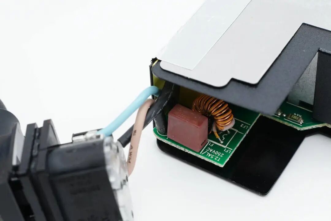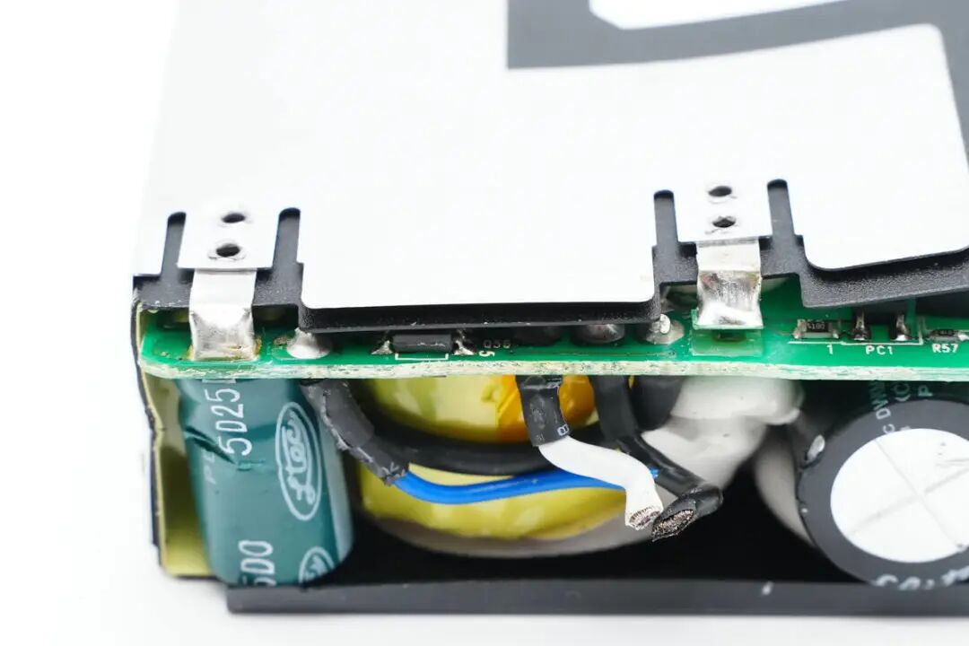 沿外壳接缝拆开充电器外壳,内部PCBA模块采用黑色麦拉片绝缘,采用铝制散热片散热。