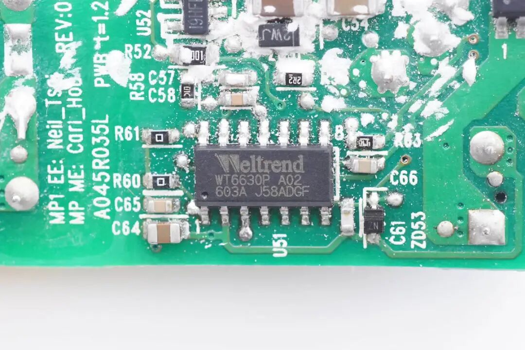 协议芯片采用伟诠WT6630P,支持USB PD 2.0快充协议,内置5V、12V、15V、20V的VBUS,可设置为30W,45瓦,60W三种输出模式。该芯片支持节电模式、过压保护、低压侧输出电流分流监控器。