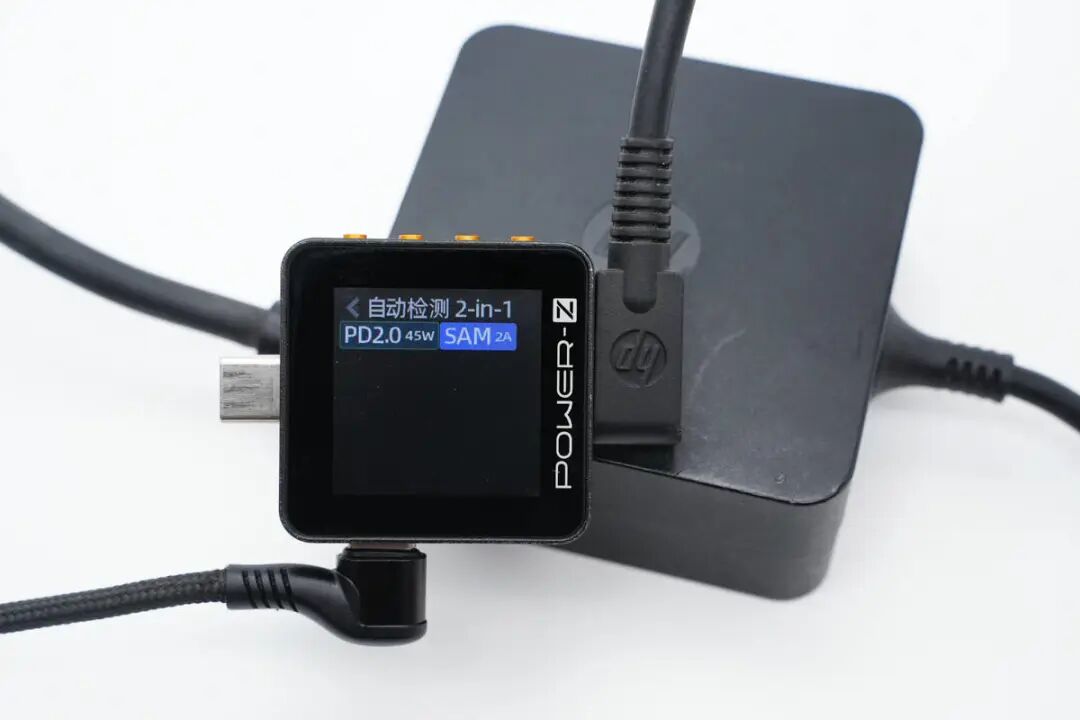 使用ChargerLAB POWER-Z KM002C测得适配器支持PD2.0、Samsung 5V2A充电协议。