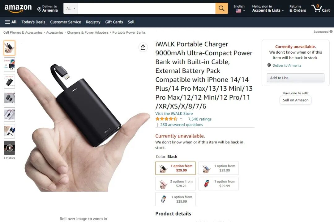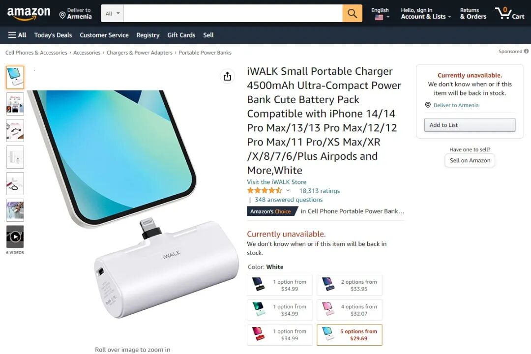 iWALK Mini Portable Charger for iPhone with Built in Cable 与榜单第三名的产品同为“直接式”充电宝,自带 L 插头,为苹果设备提供续航电力。电池容量为 3500mAh,是榜单里容量最低的充电宝,售价为 27.04 美元,评分 4.3 分,用户评论数 14882。接口配置为 1L1C。5、INIU Portable Charger