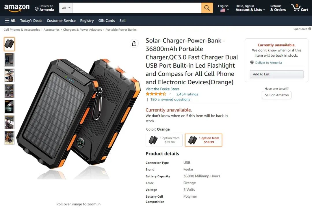 INIU Portable Charger 电池容量为 10000mAh,售价为 16.55 美元,评分 4.6 分,用户评论数 49928。接口配置为 2A1C,输出口之间集成了一个 LED 照明灯。6、Feeke Solar-Charger-Power-Bank - 36800mAh Portable Charger