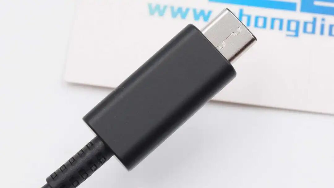 USB-C线头外壳为塑料材质,两侧为半圆弧面,表面磨砂处理,公头金属壳非一体式设计,此外还有网尾保护设计。