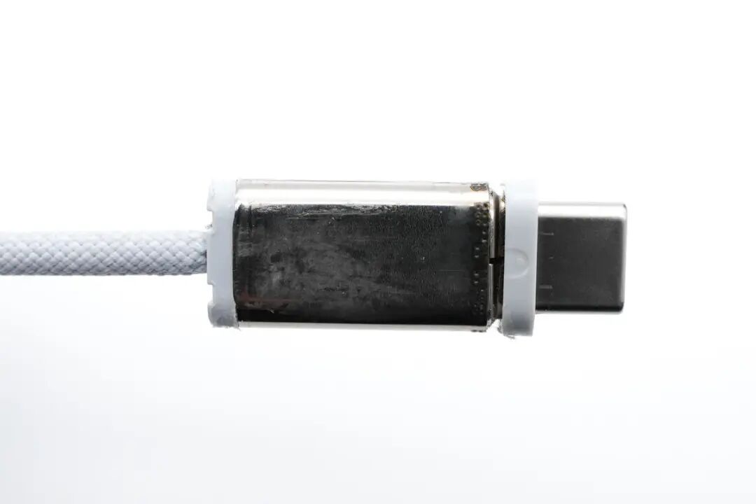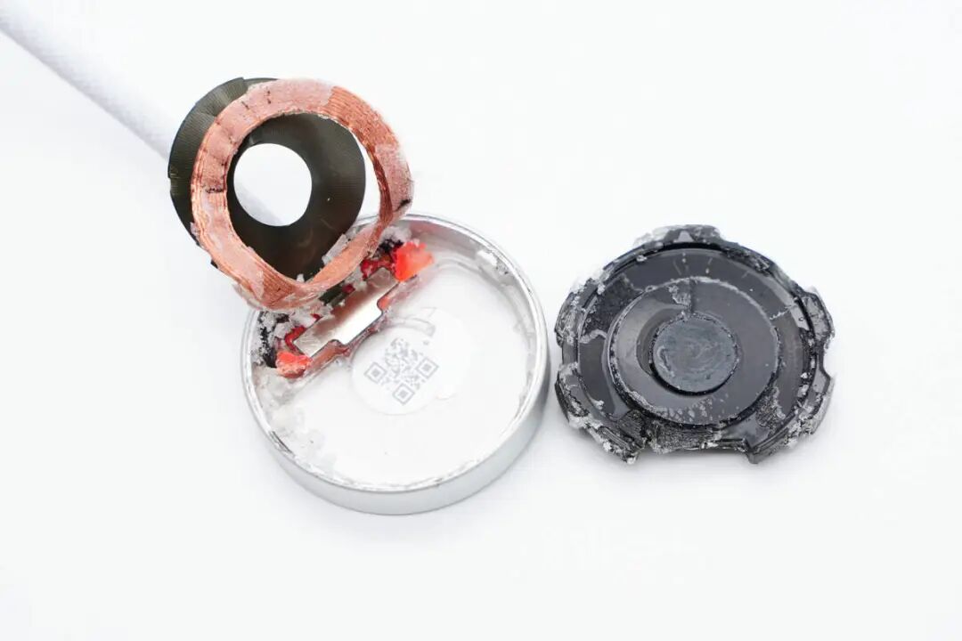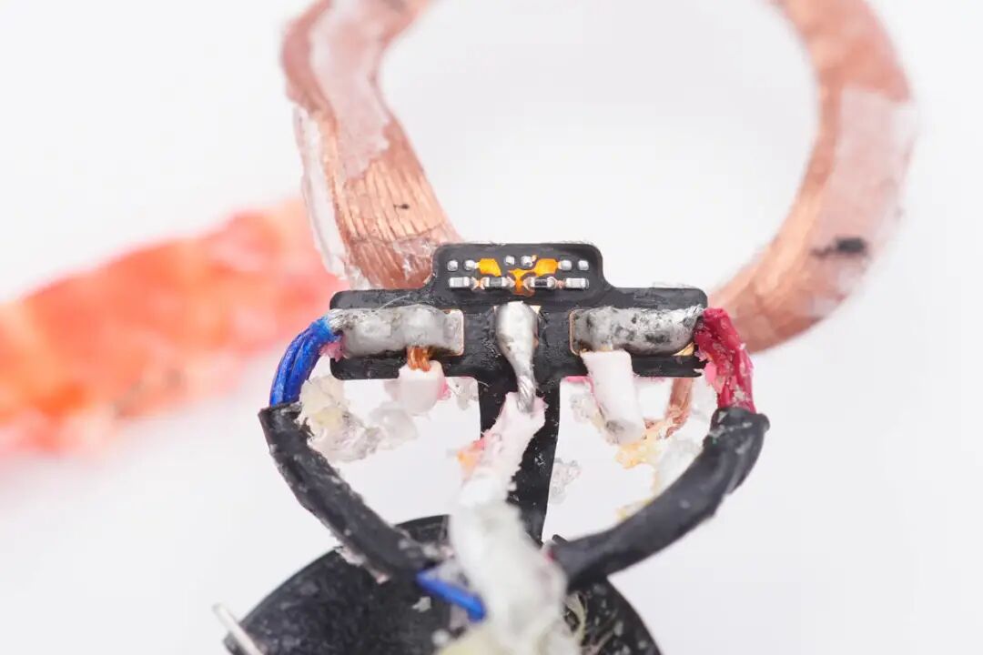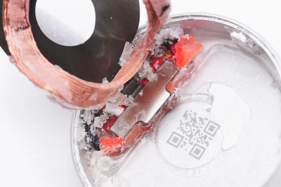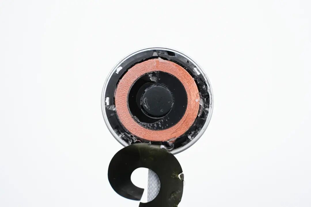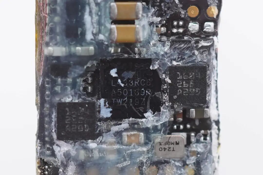 Apple Watch Ultra是苹果最新推出的超强运动手表,采用钛金属外壳和全新的表壳设计,支持100米防水,极大延伸了手表的使用场景。这款手表依旧采用Apple Watch的磁吸无线充电,并在手表包装内附赠。下面充电头网就来拆解Apple Watch Ultra附赠的无线充电器,看看内部的设计如何。苹果Apple Watch ultra包装方面依旧为苹果一贯的简约风格设计,表壳与表带独立包装。表壳包装盒底部印有相关参数信息以及产品条形码贴纸等。Apple Watch Ultra 49mm,型号:A2859;配件包括:Apple Watch(钛金属)、海峰表带以及USB-C磁吸充电线。适配要求:iPhone 8或后续机型,配iOS 16或更高版本。包装内含Apple Watch Ultra、磁吸无线充电器以及几张说明书、合格书,表此前的评测已经做过详细介绍,就不再赘述了,感兴趣的小伙伴可以查看往期评测报告,下面我们来详细了解包装内附带的磁吸无线充电器。这款磁吸无线充电器官方名称USB-C充电线,便是其自带USB-C编织线缆,既不用用户额外配线,相较来说也更加耐用。USB-C线头采用白色塑料壳,两侧半圆弧面过渡,整体高光亮面处理。无线充电小板顶面为白色塑料壳,中间凹陷设计,可以更好贴合表背。机身侧面和背面采用一体式金属外壳,拥有更高的强度保护性好。金属外壳侧边有产品参数,型号为A2515,支持5V1A输入。看完这款无线充电器的开箱和展示,下面就来拆解,看看内部的设计如何。在USB-C公头上套有塑料环,钢套与USB-C端子点焊连接固定。USB-C端子为两次点焊,首先将一层套管点焊固定到端子上,然后再点焊外层钢套。从侧面切开钢套外壳,可以看到内部PCBA模块涂有白色导热胶。清理掉表面的导热胶,PCBA模块上面的元件被注塑保护。小板正面焊接一颗单片机芯片,来自ST意法半导体,型号为STM32L433RC,是一颗内置FPU的MCU,内置超低功耗M4 32位内核,运行频率达80MHz,内置256KB Flash和64KB SRAM。在MCU两侧是两颗TI德州仪器的MOS管驱动器,型号TPS51604,是一颗双MOS管驱动器,用于驱动无线充电功率管。一颗定制芯片丝印338S00810-A0,配合下方的电感进行无线充电电压调节。无线充电输出线焊点,PCBA模块通过焊接导线连接线圈。下面来拆解无线充电线圈,首先撕下无线充电板顶部的塑料板。Apple Watch Ultra所配备的磁吸充电器采用编织线缆,不易破皮更加耐用。手表采用磁力吸附充电,延续了以往的用户体验。即使是新用户也能无学习成本的很快上手,充分享受科技带来的魅力。充电头网通过拆解了解到,苹果这款无线充内置意法半导体STM32L433RC单片机进行USB连接和降压控制,一颗苹果的定制芯片用于无线充电电压调节,两颗TI TPS51604双MOS管进行线圈驱动。无论是USB-C头还是充电板内部都做了相当足的保护措施,用料做工十分扎实。