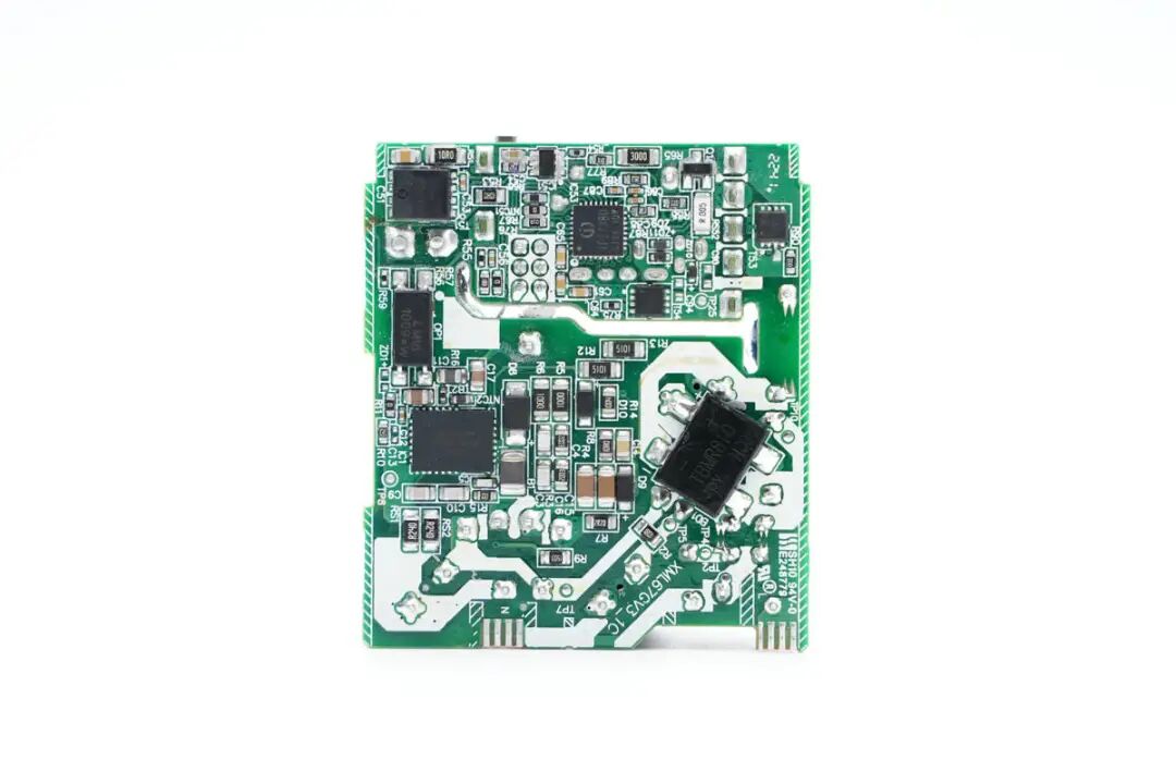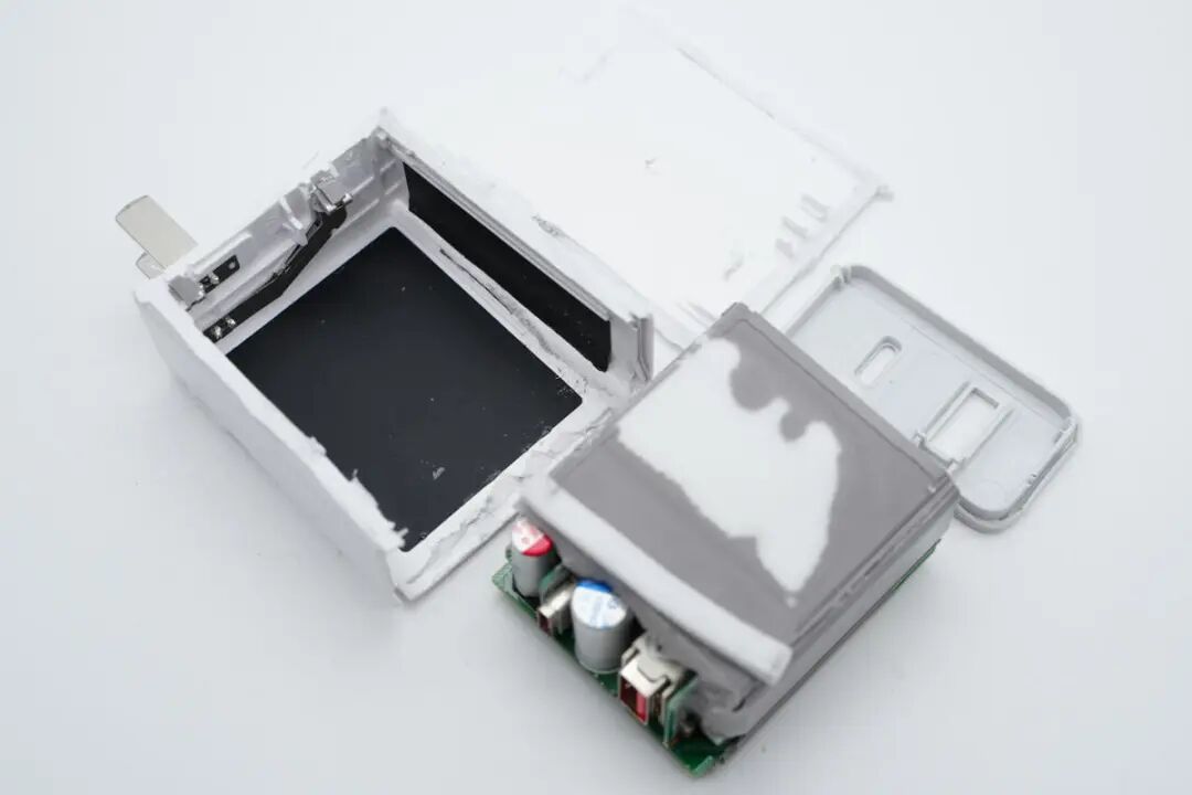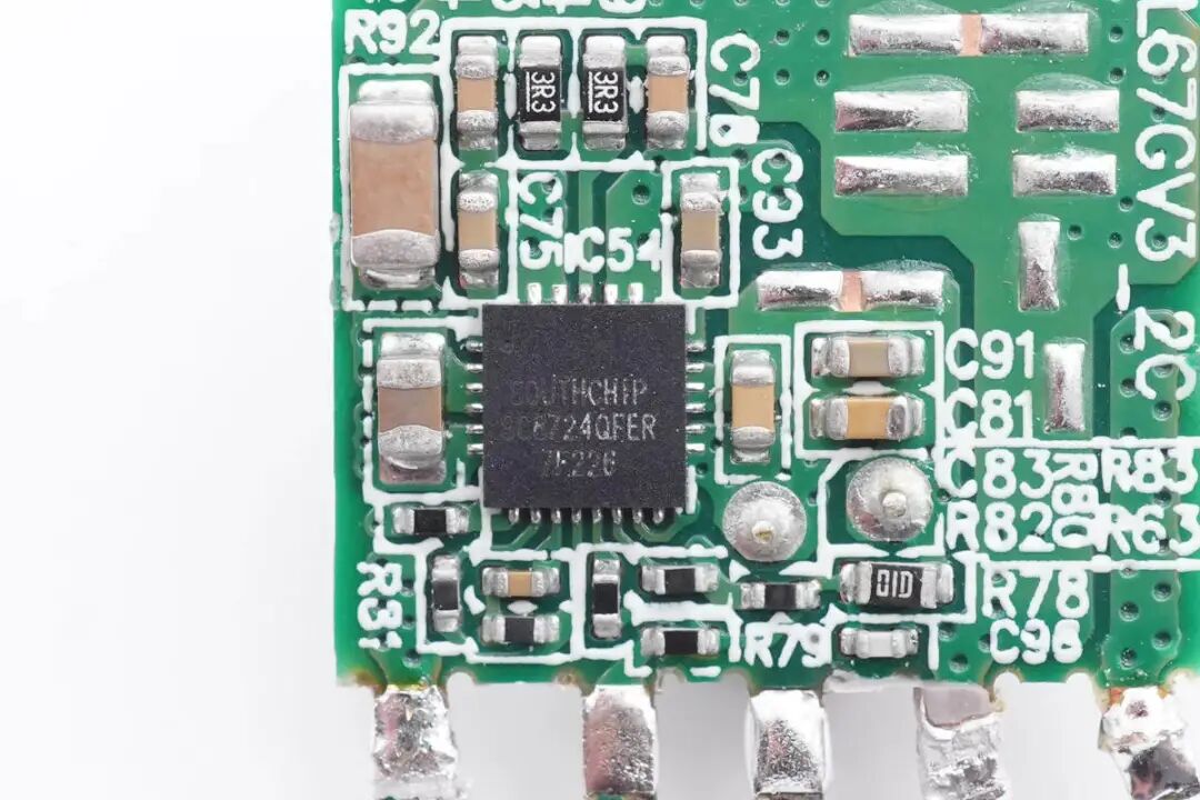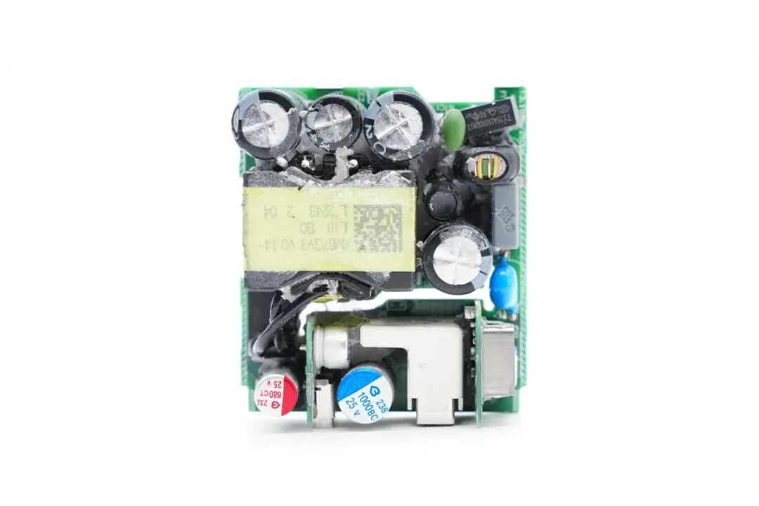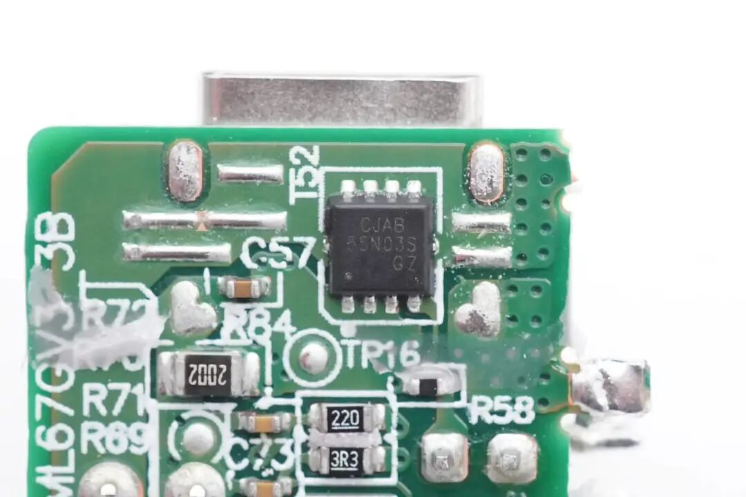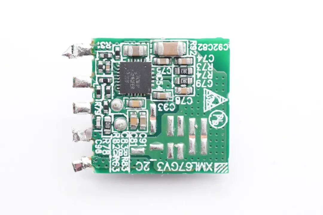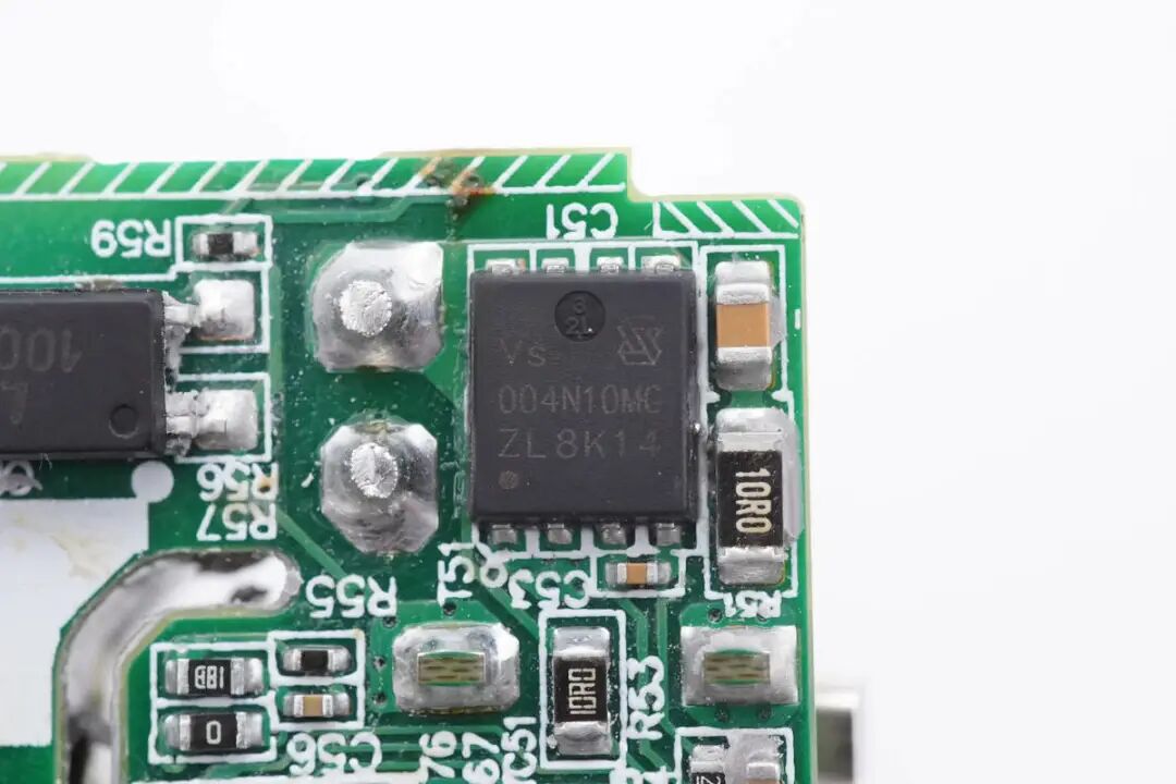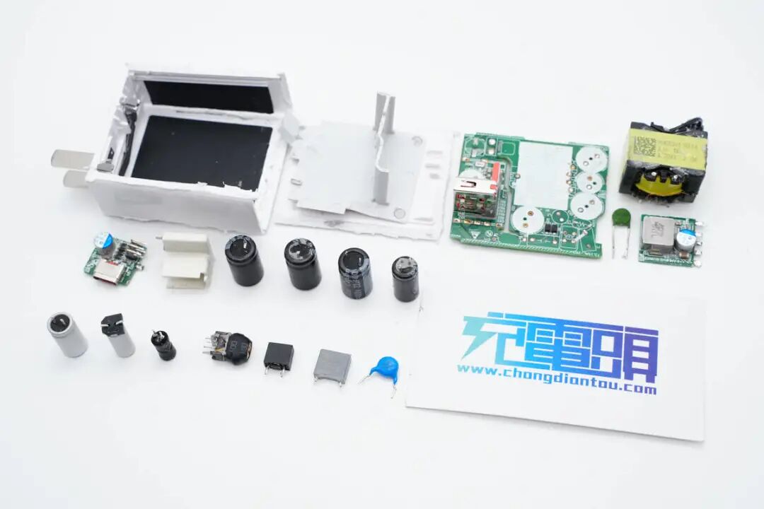 今天来拆解的是小米另外一款内置氮化镓的UFCS双口充电器,其不仅支持小米私有67W快充,还支持65W PD快充以及33W UFCS快充,做到了相当好的兼容性。充电器的USB-A口为小米魔改,搭配小米原装数据线能够实现PD快充。同时这款充电器还支持双口自动功率分配,为45+20W设计,可以在为笔记本电脑供电时同时为手机充电。下面充电头网就带来这款充电器的拆解,看看内部设计如何。包装盒设计风格和小米新款35W充电器的一样,正面印有小米logo、产品名称以及套装外观图。背面贴有充电器参数贴纸,参数到充电器实物环节再详细了解。附带数据线是小米6A魔改USB-A to USB-C快充线,线缆两端做了抗弯折处理,线头塑料壳磨砂处理,方便用户插拔使用。USB-A公头正负极加宽来通过大电流,中心处设有特殊弹片,搭配小米魔改A口充电器可实现PD快充。充电器采用PC防火材质白色外壳,腰身高光亮面处理,两侧过渡圆润,上下端平直切面,边缘过渡分明。插脚靠一侧布局,方便插拔使用。机身正面印有67W和Designed by Xiaomi。背面印有GaN和Designed by Xiaomi。USB-A/C单口输出:5V3A、9V3A、11V6.1A、20V3.25AUSB-C:5V3A、11V4A、20V2.25A输出端配备一个USB-C快充接口以及小米魔改USB-A接口。PDO报文显示C口还具备5V3A、9V3A、15V3A、20V3.25A四组固定电压档位,以及3.3-11V6.1A、3.3-20V3.25A两组PPS电压档位。此外测得UFCS融合快充具备5-11V3A、11-21V1.55A两组PPS电压档位。搭配附带6A魔改数据线测得充电器USB-A口不仅支持UFCS、QC3.0以及小米私有快充协议,还支持PD3.0快充协议。并且PDO报文和USB-C口的完全一样,具备5V3A、9V3A、15V3A、20V3.25A四组固定电压档位,以及3.3-11V6.1A、3.3-20V3.25A两组PPS电压档位。最后测得UFCS融合快充同样具备5-11V3A、11-21V1.55A两组PPS电压档位。最后是UFCS融合快充充电测试,使用充电器USB-A口给iQOO 10 Pro充电,测得功率为7.64V 2.94A 22.43W。使用充电器USB-C口给iQOO 10 Pro充电,同样开启UFCS融合快充,测得功率为7.75V 2.96A 22.95W。看完了小米67W UFCS氮化镓快充的开箱和测试,下面就进行拆解,看看内部的设计。切开外壳取出内部PCBA模块,交流输入通过弹片连接到PCBA模块供电。PCBA模块背面粘贴塑料片绝缘,在塑料片外侧粘贴一片铜箔,透过胶水依稀可见。使用游标卡尺测得PCBA模块长度约为51.81mm。拆下背面的绝缘塑料片,PCBA模块背面灌胶加强散热。清理掉PCBA模块表面的灌胶,PCBA模块正面一览,其中右上角为保险丝和NTC热敏电阻,共模电感和安规X2电容。左侧上方为高压滤波电容,在滤波电容下方是变压器,底部为输出滤波电容,USB-C和USB-A母座等。PCBA模块背面焊接整流桥,氮化镓合封芯片,反馈光耦,同步整流管和同步整流芯片,协议芯片和VBUS开关管。通过对PCBA模块的观察,小米这款充电器采用反激开关电源设计,宽电压输出,USB-C或USB-A单口输出时,输出电压由协议芯片控制,双口均支持快充。当双口同时输出时,USB-A口通过升降压电路进行5V或9V输出,USB-C口仍支持快充。下面我们就从输入端开始了解各个器件的信息。充电器输入端一览,焊接保险丝,NTC热敏电阻和共模电感。输入端延时保险丝来自CONQUER功德,MST系列超小型延时保险丝,规格为3.15A 250V,用于输入过流保护。NTC热敏电阻用于抑制充电器插电时的浪涌电流,丝印1R5D7,冷态电阻为1.5Ω,直径7mm。共模电感采用漆包线和绝缘线绕制,底部焊接绝缘支架,外套热缩管绝缘。安规X2电容来自STE松田电子,规格为0.022μF。整流桥焊接在PCB背面,来自平伟,型号TBMR810,是一颗8A 1000V的整流桥。充电器内部高压滤波电容来自丰宾,其中三颗规格为22μF400V。另一颗高压滤波电容规格为12μF400V,总滤波电容容量为78μF。充电器初级主控芯片采用南芯科技合封氮化镓芯片SC3057,这颗芯片将高性能多模式反激控制器、氮化镓驱动、氮化镓开关管、供电和保护等电路集成在一颗散热增强的QFN6*8封装内部。通过合封来简化外部元件数量,并消除传统驱动走线寄生参数对高频开关的影响。南芯科技SC3057采用了功率走线和控制走线分开的设计,降低高频开关对控制回路的影响,并通过优化的焊盘设计,优化充电器走线设计与电气性能,简化设计开发。SC3057内置165mΩ氮化镓开关管,支持175KHz开关频率,并支持X电容放电。同步整流控制器来自南芯,型号SC3503,是一颗自适应开通检测和快速关断同步整流控制器,无需辅助线圈供电,输出电压最低可低至0V,专利的自适应开通检测电路避免同步整流管误开通,兼容多种MOS,具有超低的静态电流,支持多种工作模式,支持高侧和低侧同步整流,外围元件非常精简。同步整流管来自威兆,型号VSP004N10MS-G,是一颗耐压100V的NMOS,导阻为3.8mΩ,采用PDFN5060X封装。威兆半导体 VSP004N10MS-G 详细资料。输出侧USB-C母座焊接在垂直小板上,USB-A母座一侧的小板为升降压电路,用于快充输出。两颗输出滤波电容来自绿宝石,其中一颗为BC系列固态电容,规格为1000μF 25V。另一颗为CT系列贴片固态电容,125℃耐热,规格为680μF 25V。输出协议芯片来自英集芯,型号IP2738U,USB-A和USB-C两个接口输出均由其控制。其在IP2738的基础上增添了小米私有快充协议和UFCS通用快充协议。IP2738是一颗双路协议芯片,支持双口18-140W快充应用,具备独立的反馈控制,具备独立的USB PD控制,相当于两颗IP2736整合到一颗芯片内部,快充规格与IP2736相同。支持USB PD3.1 28V EPR档位,并支持PD3.0/PPS等丰富全面的快充协议,兼容性非常好。英集芯IP2738内置四