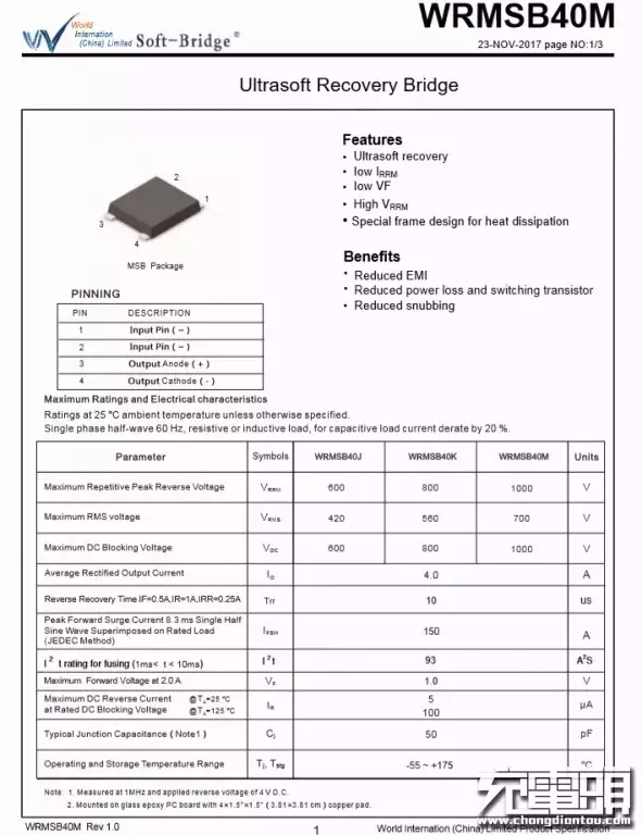 两颗整流桥来自深圳市沃尔德实业有限公司,型号WRMSB40M,这颗软桥通过较软的恢复曲线,比较平滑的关断特性,可以降低二极管结电容达到非常少的谐波振荡产生的效果。