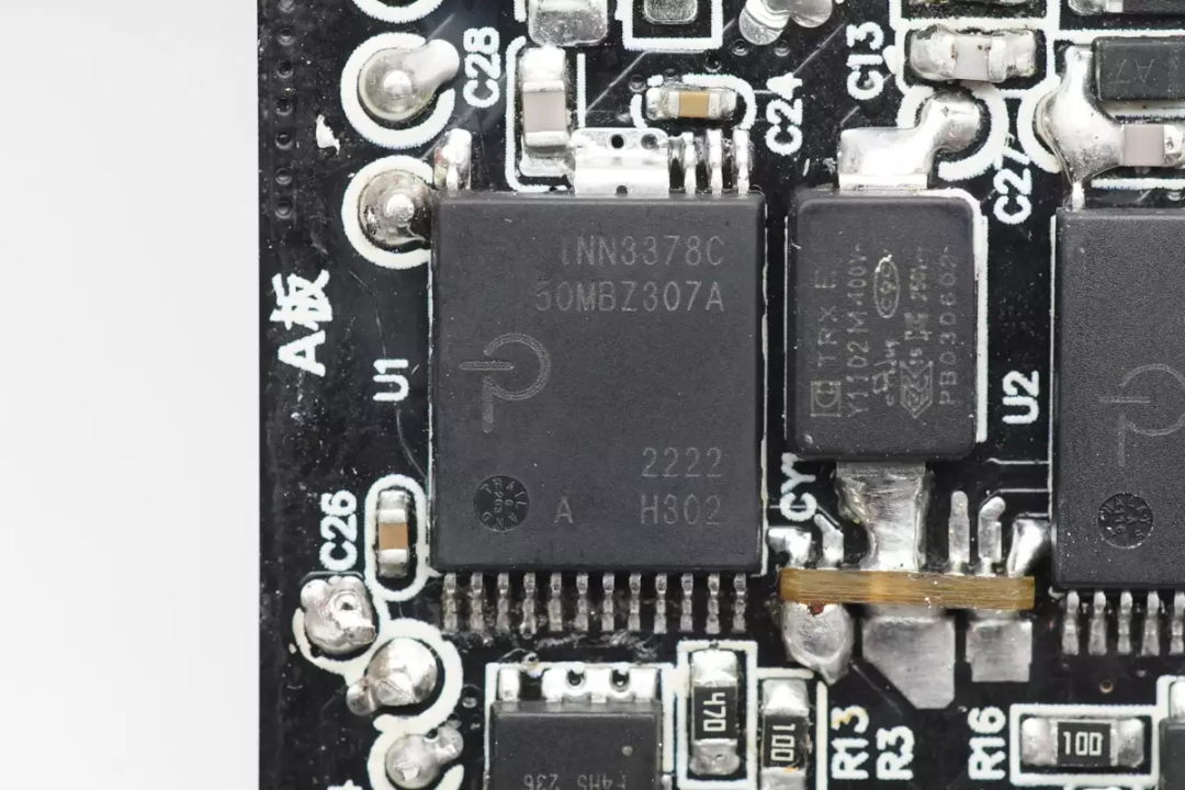另一颗主控芯片为PI INN3366C,同属于InnoSwitch3-Pro家族,内部集成650V耐压的MOS管,支持数字总线控制调压,支持宽电压27W适配器应用。