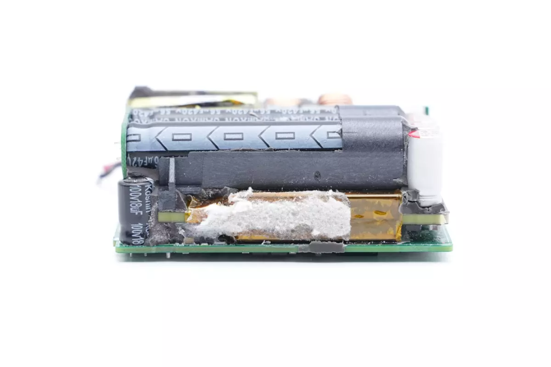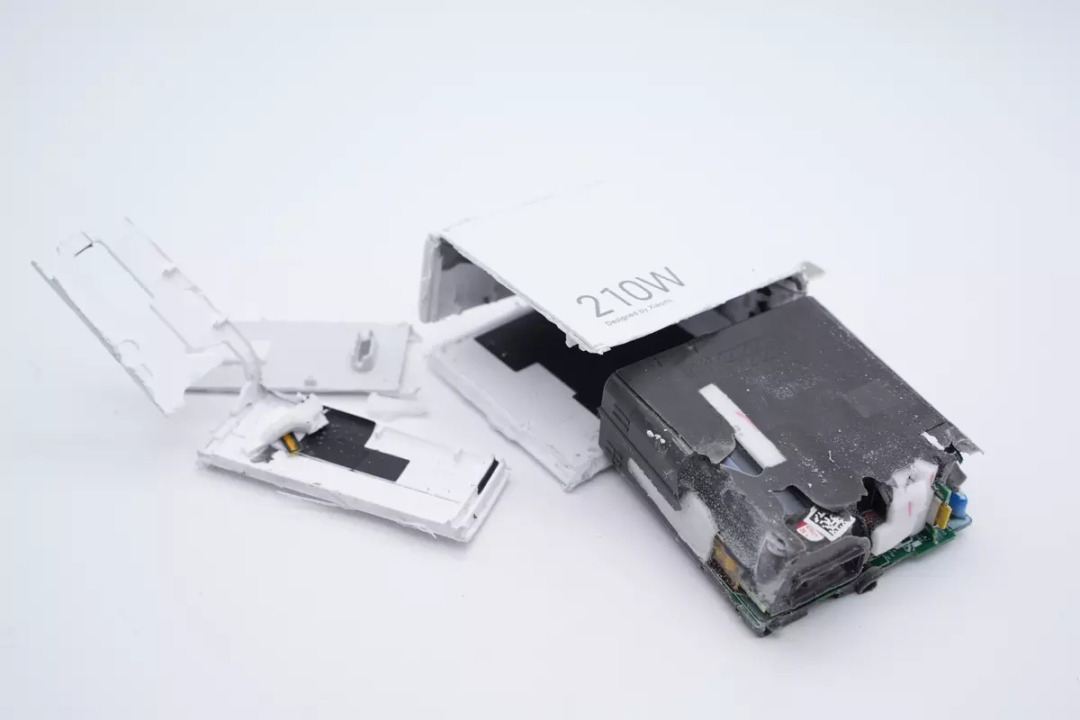 看完了这款充电器的外观和协议测试,下面就对充电器进行拆解,看看内部的设计和用料,是怎么做到210W超大功率输出的。首先使用切割机切开外壳,充电器内部PCBA模块灌胶填充,增强散热能力,并且增加热容量,降低快充时的温升。PCBA模块一览,整体采用灌胶填充,填充元件之间的空隙。![]()
