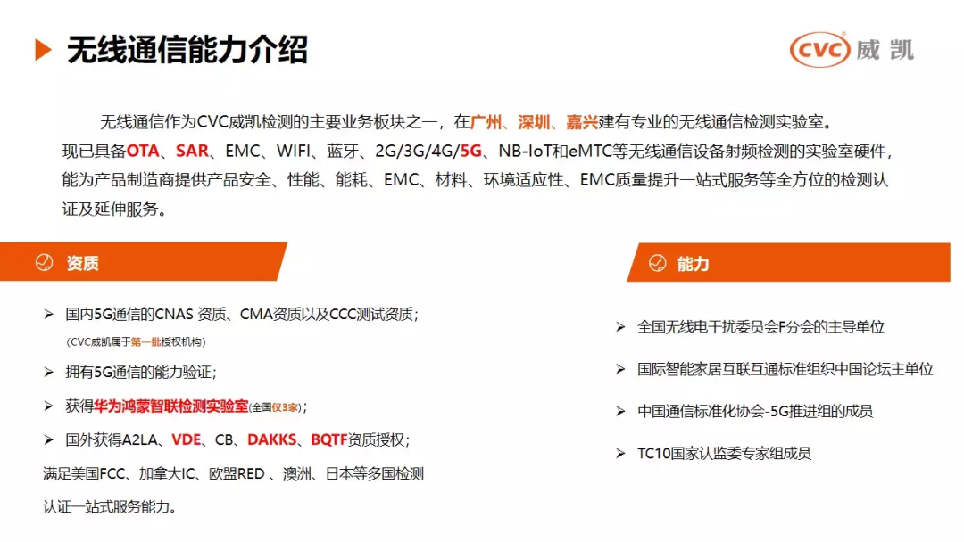 无线通信作为CVC威凯检测的主要业务板块之一,在广州、深圳、嘉兴建有专业的无线通信检测实验室。现已具备OTA、SAR、EMC、WiFi、蓝牙、2/3/4/5G、NB-IoT和eMTC等无线通信设备射频检测的实验室硬件,能够为产品制造商提供产品安全、性能、能耗、EMC、材料、环境适应性、EMC质量提升一站式服务等全方位的检测认证及延伸服务。