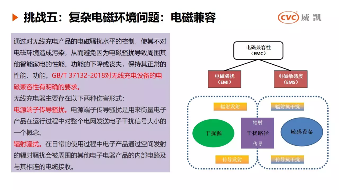 挑战五是复杂电磁环境问题——电磁兼容,通过对无线充电产品的电磁骚扰水平的控制,使其不对电磁环境造成污染,从而避免因为电磁骚扰导致周围其他智能家电的性能、功能的下降或丧失,保持其正常的性能、功能。GB/T 37132-2018对无线充电设备的电磁兼容性有明确的要求。无线充电器主要存在电源端子传导骚扰和辐射骚扰两种伤害形式。
