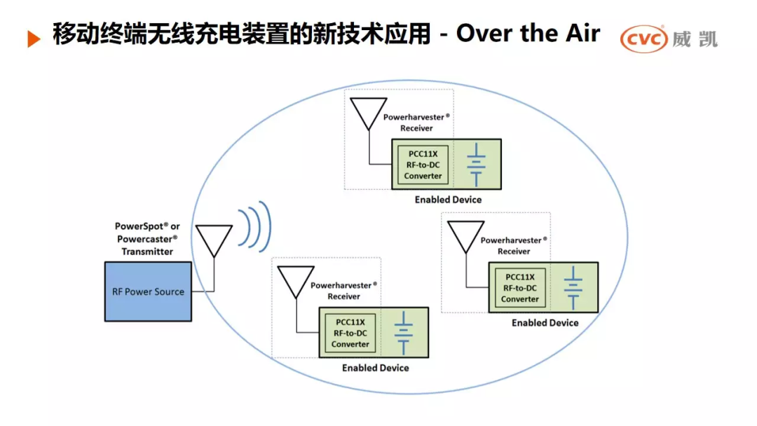 Over the Air无线充电技术原理图,简单来说就是无线充电发射装置将RF能量发射出来,可充电设备与之配对之后接收,通过芯片将RF能量转换充电。