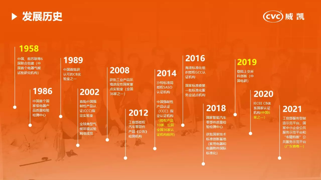 CVC威凯检测成立于1958年,成立目的是让中国家用电器销往海外有质量保障,2002年威凯成为首批中国强制性产品认证(CCC)指定实验室,2014年拿到CCC认证发证资质,2020年成为中国6家IECEE CB体系国家认证机构之一。
