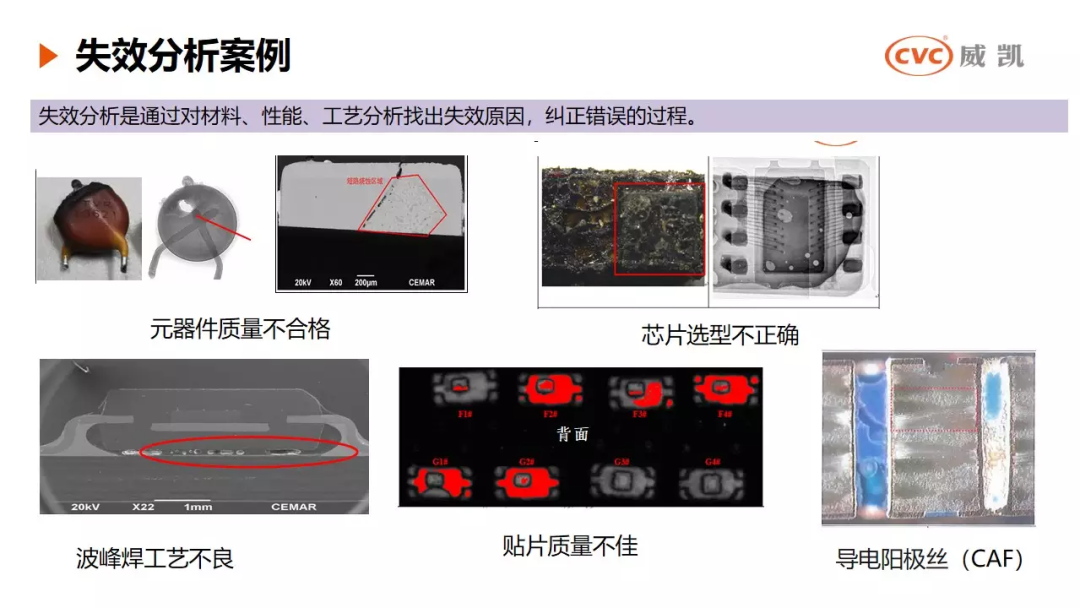 产品失效或出现问题,往往与元器件质量不合格、芯片选型不正确、波峰焊工艺不良、贴片质量不佳、导电阳极丝(CAF)等因素息息相关,威凯检测有专业团队提供检测服务,有需要的可联系威凯洽谈。