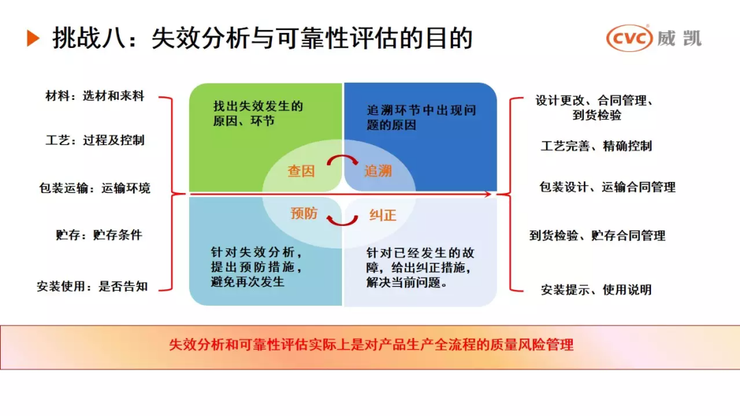 挑战八是失效分析与可靠性评估的目的,通过找出产品失效发生的原因、环节,追溯环节中出现问题的原因,针对失效分析,提出预防措施,避免再次发生。