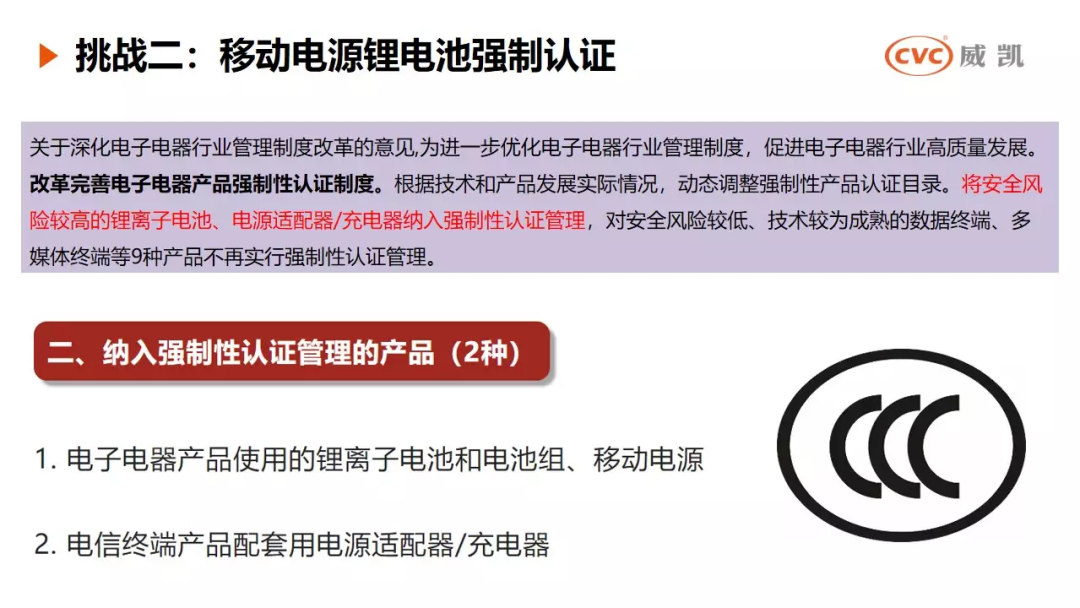 挑战二是移动电源锂电池强制认证,电子电器产品使用的锂离子电池和电池组、移动电源以及电信终端产品配套用电源适配器/充电器纳入强制性认证管理。