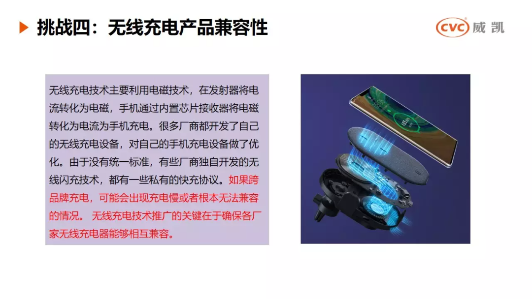 挑战四是无线充电产品兼容性,目前很多厂商都开发了自己的无线充电设备,不过部分独自开发的无线闪充技术,都有一些私有快充协议。如果跨品牌充电,可能会出现充电慢或者根本无法兼容的情况。无线充电技术推广的关键在于确保各厂家无线充电器能够相互兼容。