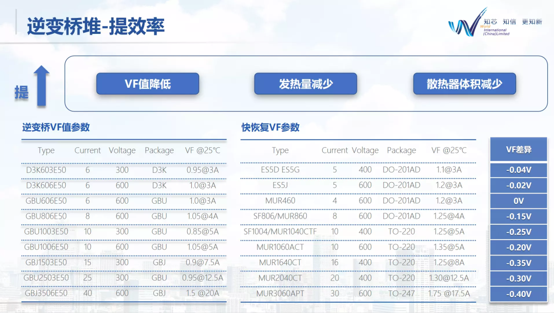 逆变桥堆虽是桥堆,但又非传统意义上的桥堆,因采用精简模块化设计,逆变桥堆是一颗具备四颗独立整流功能的桥堆,真正的“四芯合一”;精简模块化的最大好处是实现材料成本降低(含减小散热器体积、器件材料),提高生产的效率(传统方法要实现桥式电路原理,需要四颗分立器件或者一颗共阴和一颗共阳分立器件,装配费时费工),提高产品一致性和稳定性。并且,相对传统分立器件组桥方式,逆变桥堆占地材料面积缩小40%,人工成本也相对应的减少1.5个,对布板空间面积要求进一步降低,对产品设计的美观和空间延展性,便携性,包装和运输费用都有非常好的行业开创性。众所周知,桥堆的Vf值是系统设计中非常重要的一个参数,对能源转换效率有非常重要的影响。沃尔德实业推出300V,600V,800V系列产品,通过更精准的工艺跟材质配比,实现更优的Vf正向压降。沃尔德实业持续高研发投入,深度参与电路应用设计,对优化EMI特性有丰富的经验,在电性参数优化和封装集成上,产品一次封装成型,较少走线距离,芯片均匀分布,电路寄生电感和结电容的降低,使得EMI效果更好。沃尔德实业逆变桥堆结合市场需求,现拥有8种封装(ABS、MSB、LSB、D3K、GBU、GBJ、DXB、DXT),为客户免费提供样品,免费提供EMI传导评测,免费提供热安全评估,给予客户了更多储能选择。两年间,储能从电源到光伏,市场变化之快,沃尔德产品线不断的完善,对客户来说,其不同业务程度要求不同,沃尔德从8种封装(3种贴片,5种插件),2A到80A,共40余种型号选择,涵盖市场90%+的客户100W-5000W逆变桥堆的场景需求;沃尔德实业跨领域、跨层次的产品统筹布局,是来自对产品的深入研发的成果和对产品质量严格把控的自信,实现提高生产效率的同时不断提升产品水平。四芯合一的逆变桥堆出现,大大减少了电子垃圾的产生,助力我国绿色可持续发展战略和“双碳”目标早日实现。
