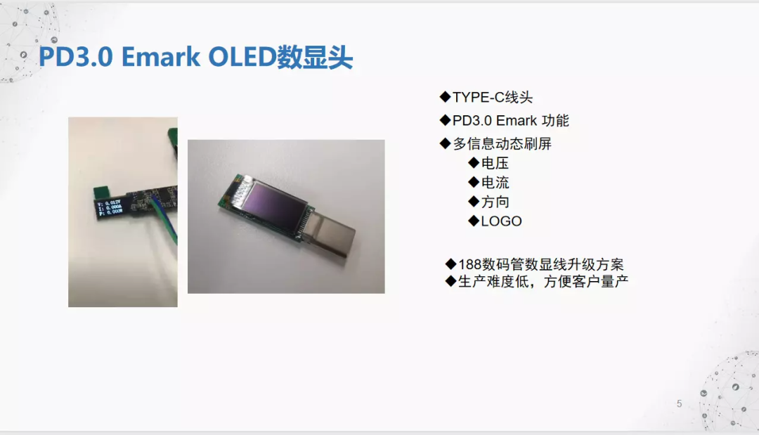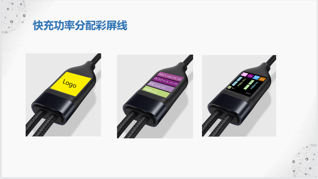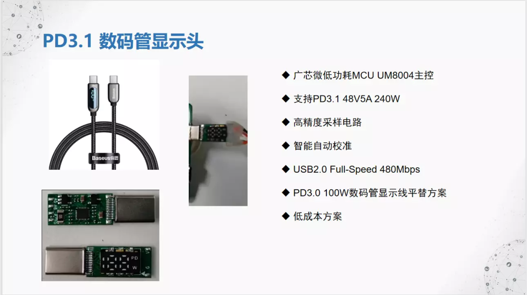 现在充电速度和充电功率不断提高,但是我们不能直观的看到充电时的电压和功率,为了让用户实时看得见快充的真实速度,广芯微在数据线基础上推出数显线来解决这个问题,以此让大家掌握设备充电时的状态,增加用户和线材的交互和增加线材的实用性。随着PD3.1标准的推出,PD充电功率上升至240W,各大手机厂商也纷纷推出自己私有协议快充推高手机快充功率来做为卖点,对用户来说能看见的快充能更加贴近用户侧使用感受,看的见的快充才是真快充。所以广芯微电子利用UM3506芯片资源上的优势,推出了一系列数显线方案供各大配件生产厂商选择。广芯微电子(广州)股份有限公司 销售经理沈玮先生参加了此次线上直播,并且还为我们带来了《真快充看的见 广芯微UM3506 数显线方案介绍》主题演讲,主要以快充的飞速发展、PD3.1 Emark 彩屏数显线、PD3.0 Emark OLED数显头、PD3.1 数码管显示头、快充功率分配彩屏线、快充功率分配彩屏线、PD Plus SoC芯片-UM3506系列、PD芯片-UM3506 核心亮点共八个部分介绍。广芯微电子深耕PD市场8年,熟悉从芯片原厂到3C配件生产商到最终用户整条PD产业链,销售经理沈玮先生拥有深厚的行业经验,深知贴近用户从用户体验出发的方案才是好方案,对用户来说能看见的快充能更加贴近用户侧使用感受,看的见的快充才是真快充。PD快充的飞速发展在不断触动着消费着的感官,清楚感知快充的充电速度、充电时长,商用PD快充已经发展到个位数时长的充电时间,快量化后是用户看得见的。PD3.1 Emark 彩屏数显线的主芯片为UM3506,利用UM3506的高集成度,可实现线材的更多功能。PD3.1 Emark 彩屏数显线的芯片UM3506可以支持多种DIY,包括UI界面定制、添加实体按键、屏幕DIY等,同时配备节能与睡眠模式,满足待机能效要求。内置PD3.0 Emark OLED数显头的,可以实时显示多种功能,是188数码管数显线的升级方案,但生产成本低,可以让更多的用户能够看得见的电流、电压、LOGO等实时中英互动显示,增强用户交互效果。广芯微在PD3.0 100W数码管显示的平替方案上,开发出内置MCU UM8004主控的PD3.1方案,更低功耗的同时支持更高的功率,自带智能自动校准和高精度的采样,拥有更强产品竞争力。在快充线上搭配智能彩屏,实时看到当前的运行状态,可以吸引更多用户的选择。开机首屏可以定制图片同时产品内部可以加持多种智能化功能,可扩展到其他设备上使用,更加方便厂商推广,增加产品的可玩性,拉进用户、产品、厂商的交互距离。PD Plus SoC芯片-UM3506的详细信息,支持多种接口和协议,满足PD3.1、PD3.0的规格的多种模式,支持持续升级和灵活扩展,适配多种产品的应用。UM3506协议芯片更像一个系统平台,多种差异化设计的应用,软件和硬件都有不同程度的设计方案,增强UM3506的应用扩展,满足厂商各种需求,设计出各种差异化产品,增加厂商的竞争力。数显线出来之前,大家无法清晰的掌握设备充电时的状态,不能直接感觉到功率提升。为此广芯微在满足以上要求之后,还给数显芯片加入了温升功能、节能功能、协议写入、DIY定制等功能,既保证线材的安全还能提高线材的可玩性,同时支持协议功能写入可以兼容更多设备使用,解决用户需要经常寻线的烦恼和减少不必要的电子垃圾,功能性与实用性兼备,居家旅行必备良品。![]()