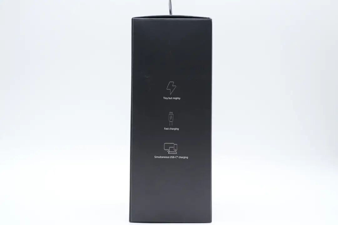 侧面是产品三大卖点标识,小巧且性能强大,快速充电,适配手机、笔电、iMac等USB-C设备。
