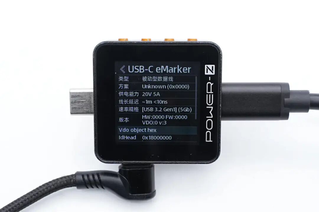 另外使用ChargerLAB POWER-Z KM002C测得数据线带有数据线E-Marker芯片,电力传输能力为20V5A 100W,数据传输能力为USB 3.2 Gen1(5Gbps)。