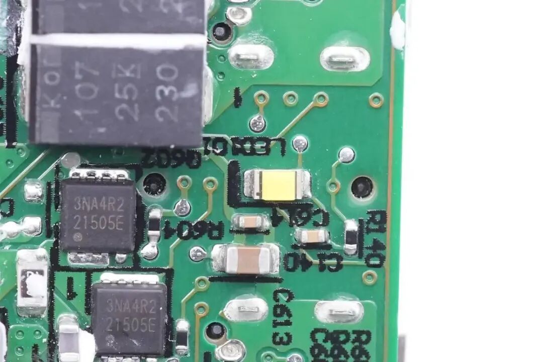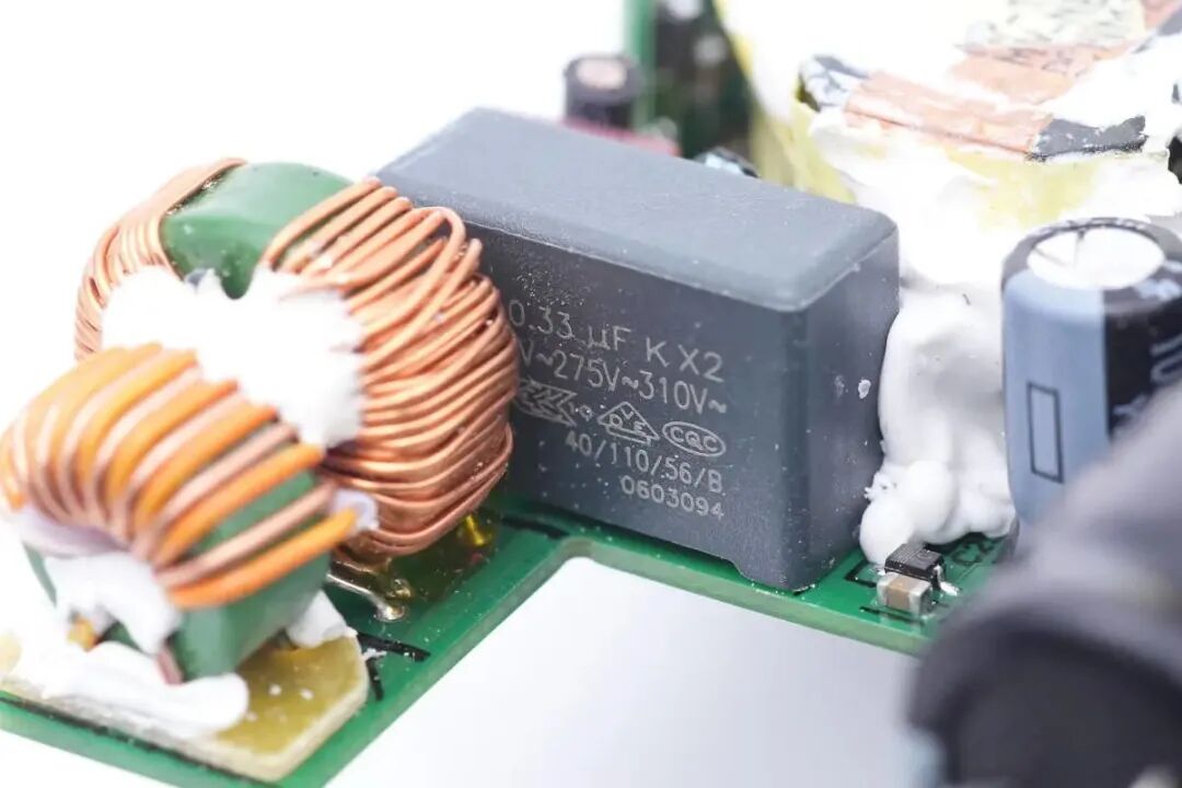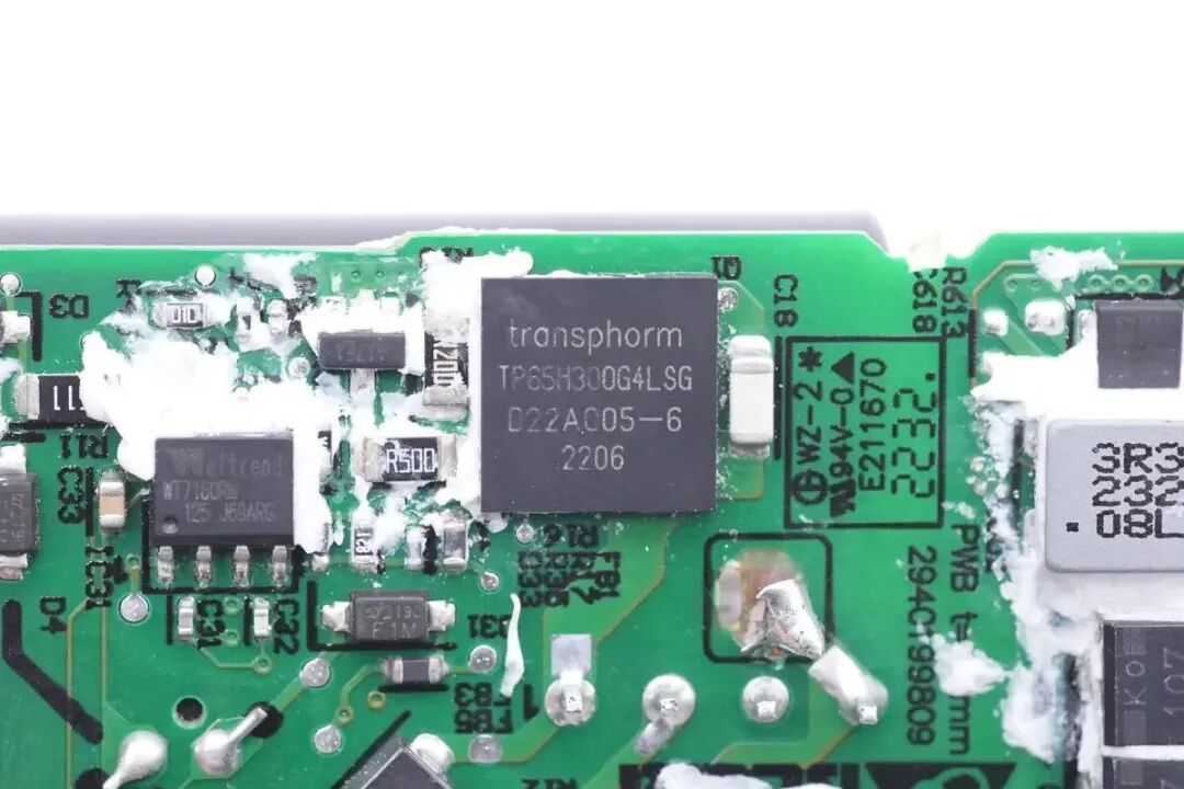 通过对PCBA模块的观察,惠普这款65W氮化镓电源适配器采用反激开关电源架构,采用Transphorm氮化镓开关管,同步整流,固定电压输出。输出电压由英飞凌协议芯片内置的降压电路进行降压输出,实现双口宽电压输出。下面我们就从输入端开始了解各个器件的信息。