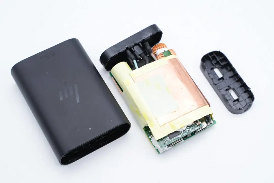 这款电源适配器还具备两个USB-C输出接口,支持单口65W功率盲插和双口功率自动分配,并且支持PPS快充,对笔记本电脑和手机都有很好的快充兼容性。下面充电头网就对这款惠普电源适配器进行拆解,一起看看内部的用料和设计。