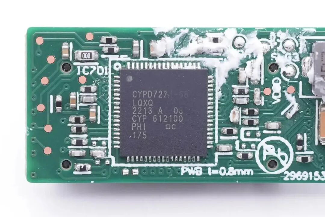 协议芯片来自英飞凌,型号CYPD7271,为CCG7DC系列,是一颗高度集成的USB-C口充电器解决方案,内部集成两路升降压控制器,专为多口充电器而设计。芯片内部集成NMOS驱动器用于VBUS开关管控制,内部集成硬件控制的保护功能,支持4-24V输入电压,支持可编程的开关频率。