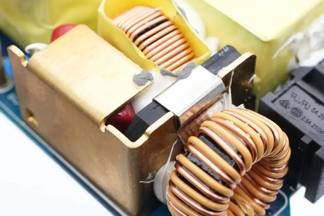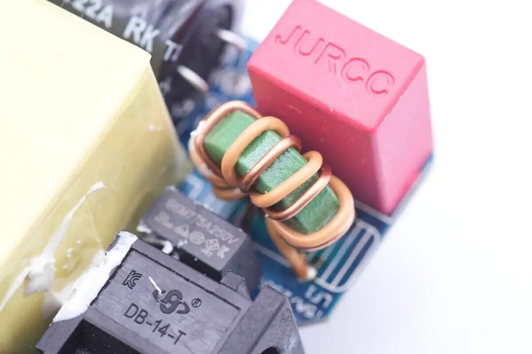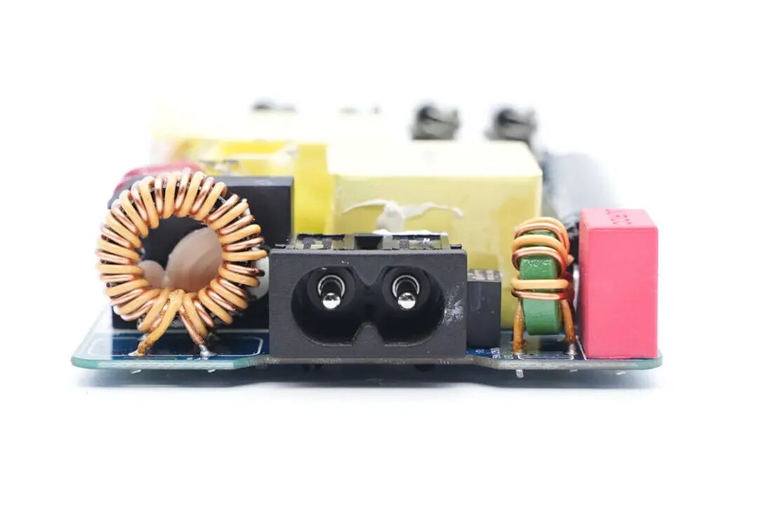 充电器输入端焊接共模电感,八字线插座,保险丝,共模电感和安规X2电容。