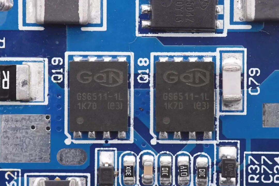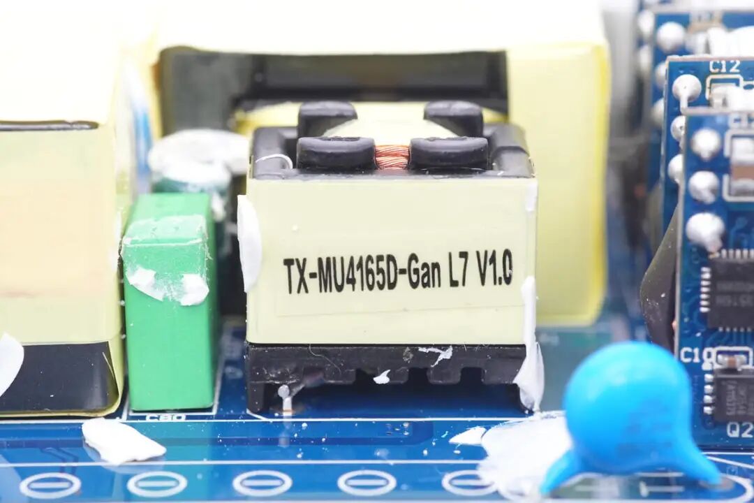 PCBA模块背面焊接一颗PFC+LLC二合一控制器,下方焊接两颗LLC开关管,右侧焊接两颗并联的PFC开关管和升压整流管,其中氮化镓PFC开关管来自GaN Systems,碳化硅二极管来自泰科天润,左上角焊接同步整流控制器和同步整流管。