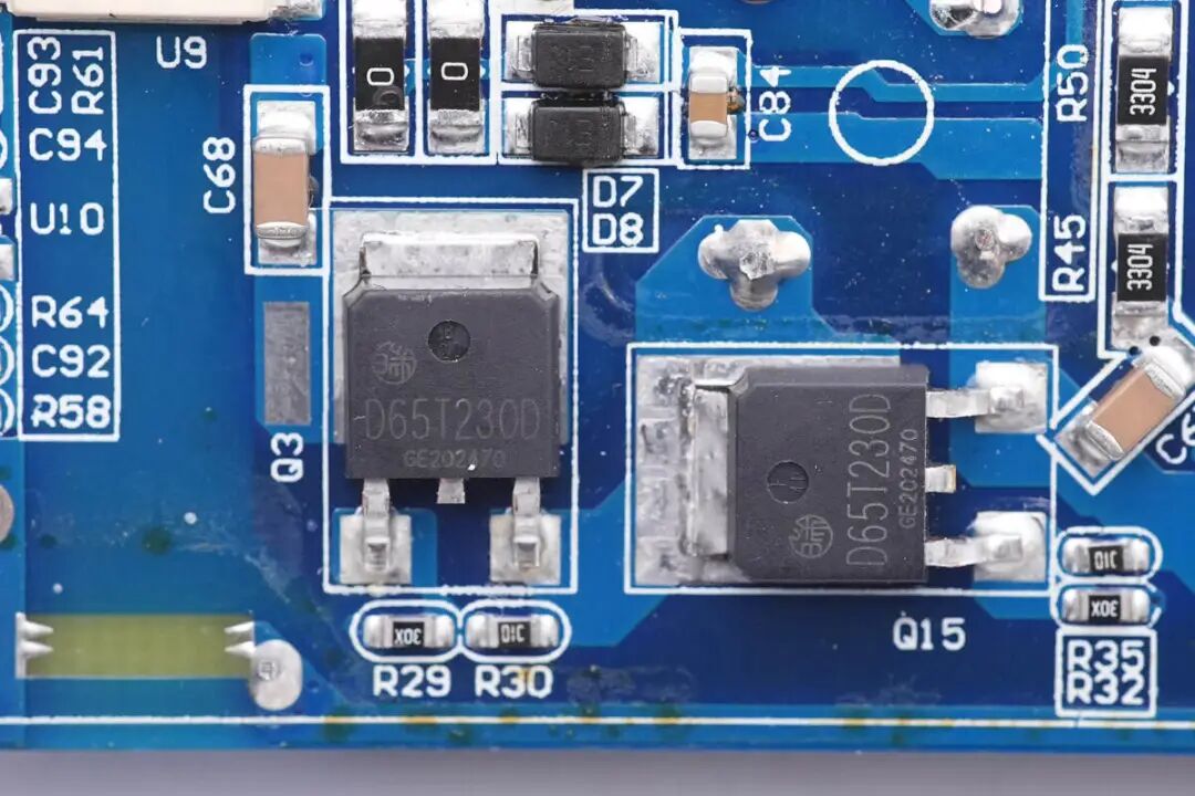 两颗LLC开关管来自华瑞微,型号HRD65T230D,超结NMOS,耐压700V,导阻230mΩ,采用TO252封装。