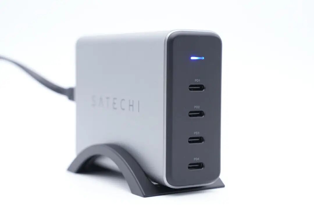 SATECHI这款四口氮化镓桌面充电器为银色外观设计,具备四个USB-C接口。充电器总输出功率为165W,单个接口均支持100W快充,功率自动分配功能可以满足三到四台设备的同时充电需求,同时满足手机,笔记本电脑等设备供电需求。充电器采用八字线供电,并配有垂直支架,使用灵活方便。