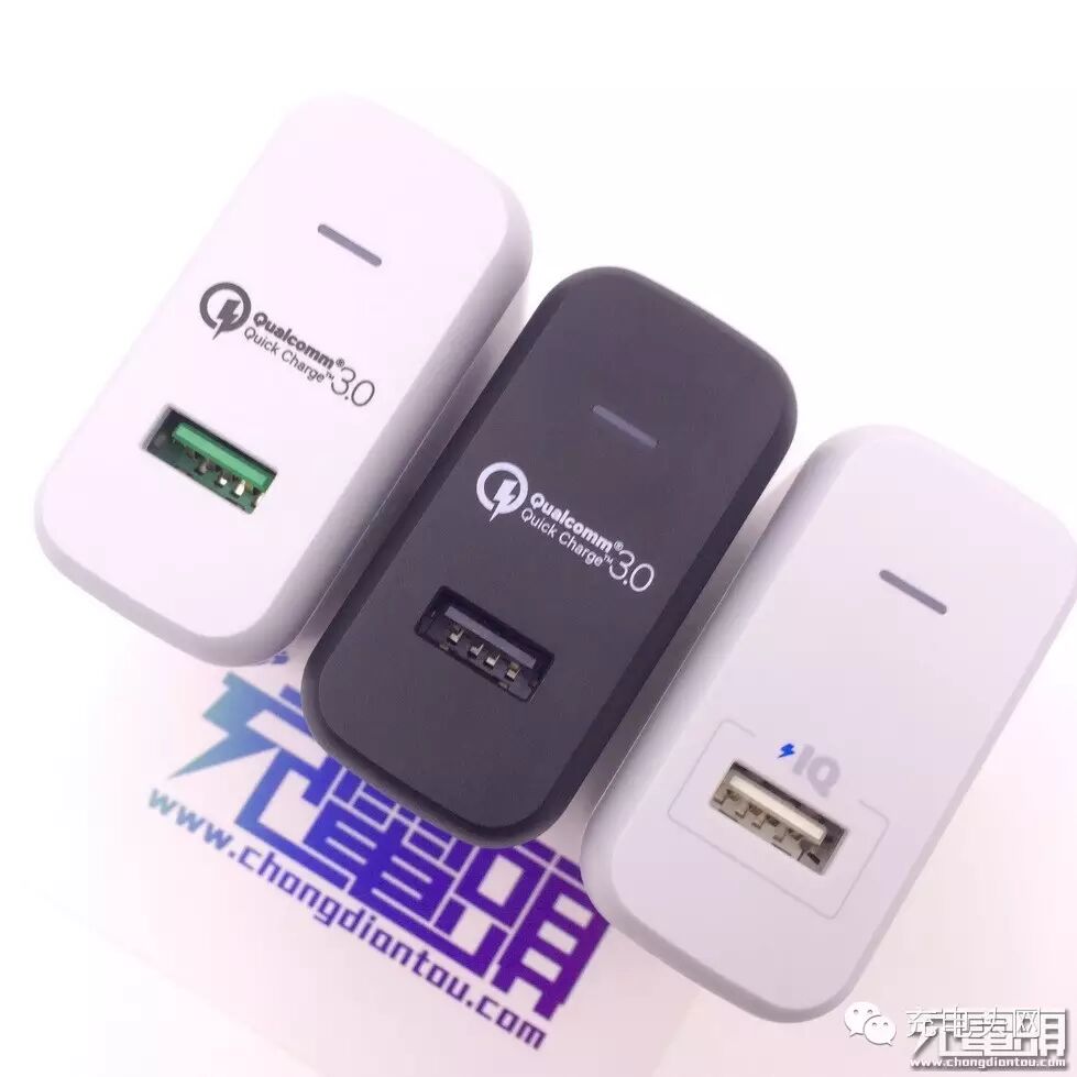 可以看到QC3.0充电器比QC2.0充电器多了一个在前面板的高通QC3.0标识,这也是二者在外观上最大的区别了,另外白色版和黑色版的QC3.0充电的USB胶芯颜色也不同。