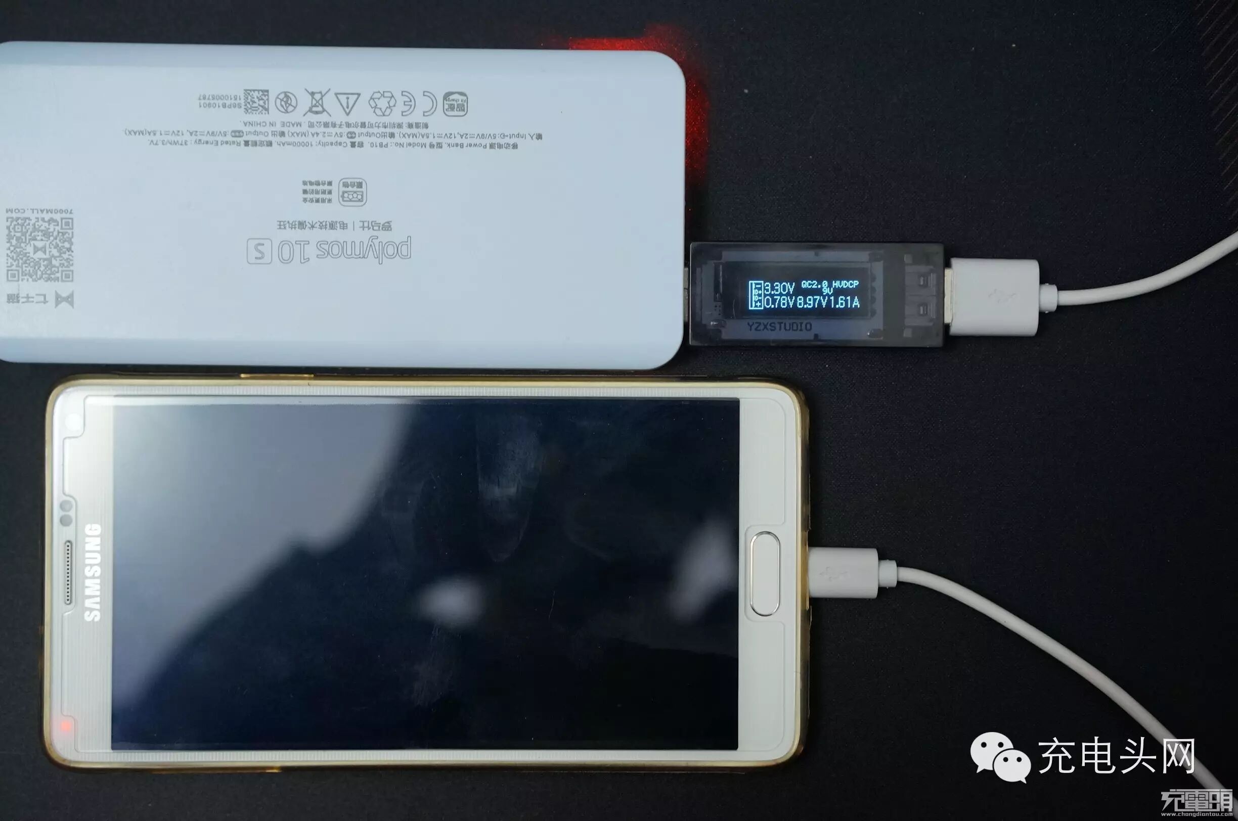 目前在使用快充技术的移动电源都面临一个兼容性问题,Polymos 10s也不例外,对苹果设备的支持上有些握手方案没做好所以苹果设备只能以1A状态进行充电。但小编不解的是非QC口也没做好识别芯片,两个口都不兼容苹果设备。而安卓方面,笔者试了note4,怎么插都是满载,5V1.7A、9V1.6A 全速充电。