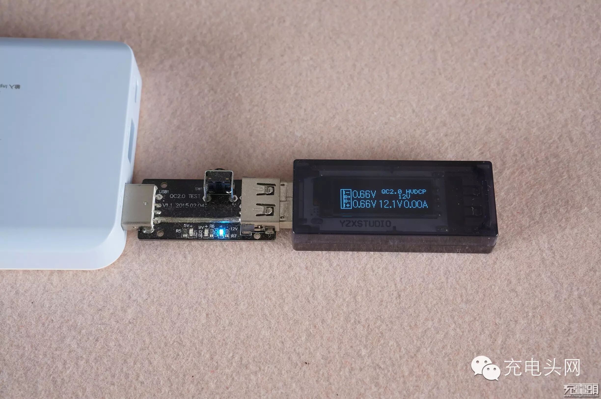 在接口输出方面,普通5V口默认是使用安卓1.5A模式的识别电阻,待机电压5.16V。对快充口使用诱骗器进行多档电压申请握手,皆可以正常诱骗出9V12V。快充口5V待机电压5.16V、9V待机电压9.17V、12V待机电压12.1V。