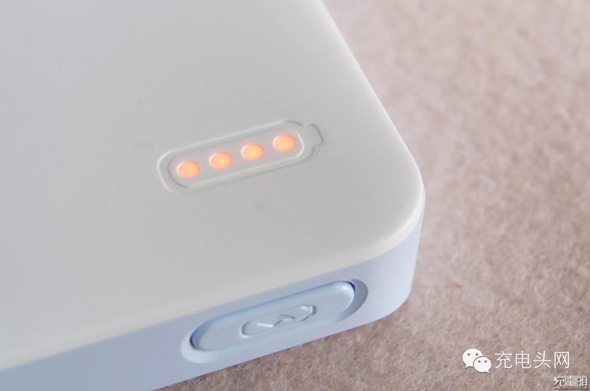 主机简约设计风格,使用了一个实体键用来激活输出,按下激活键后面板上4个LED电量指示灯亮起,颜色是罗马仕经典的桔色,几乎所有产品都用这个主打色。