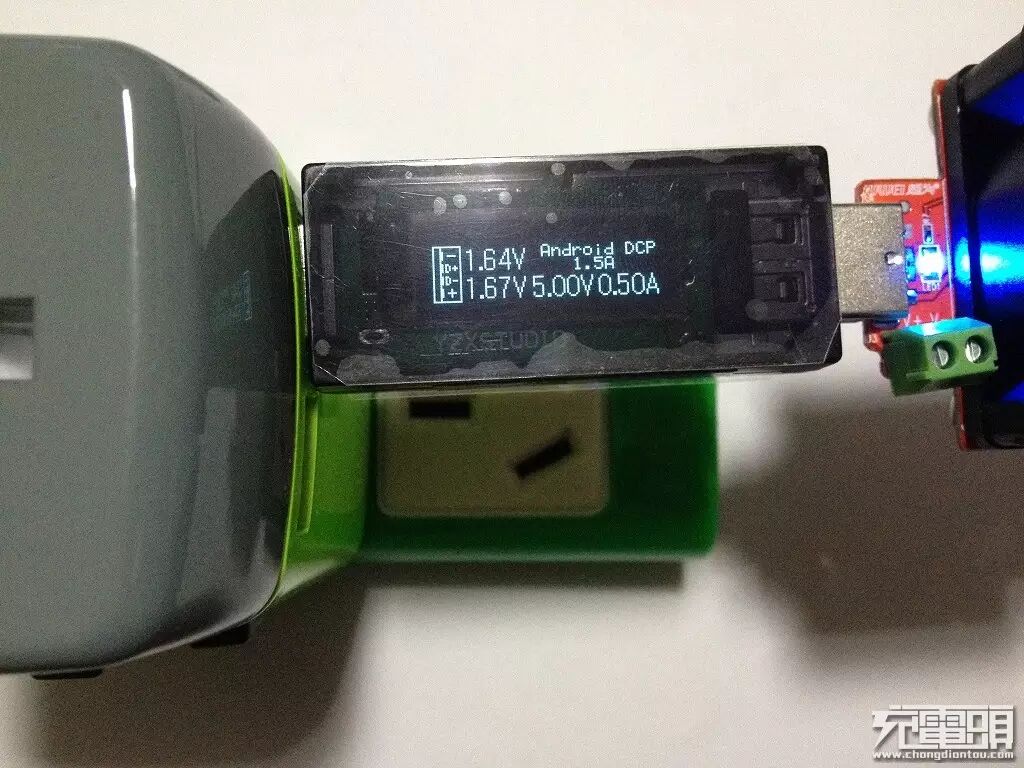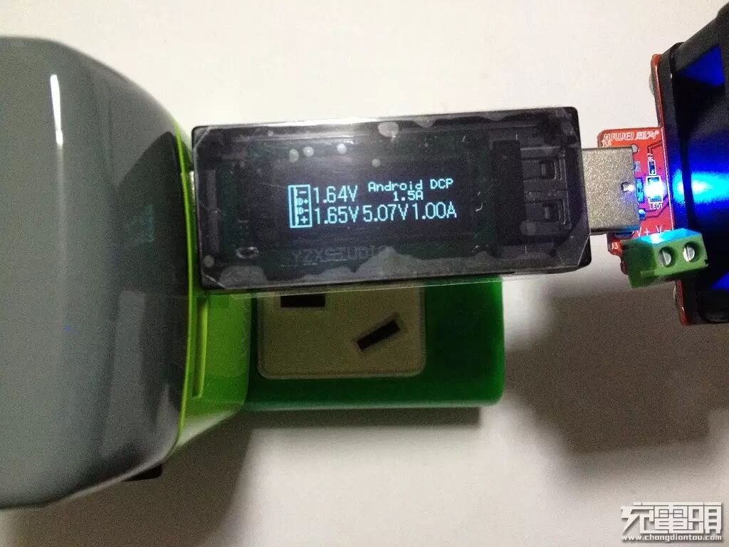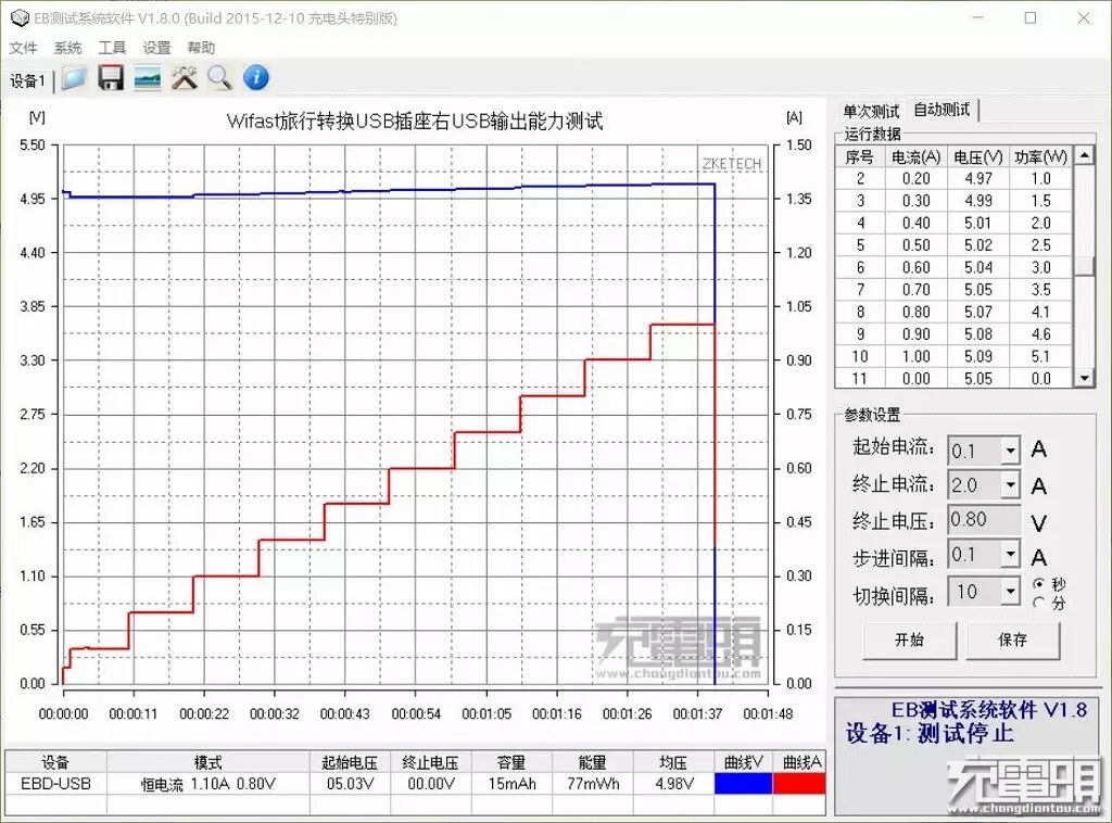9、用EBD-USB测试Wifast旅行转换插头充电器2个USB接口的输出性能,有轻微的线补,电流超过1A会自动保护。