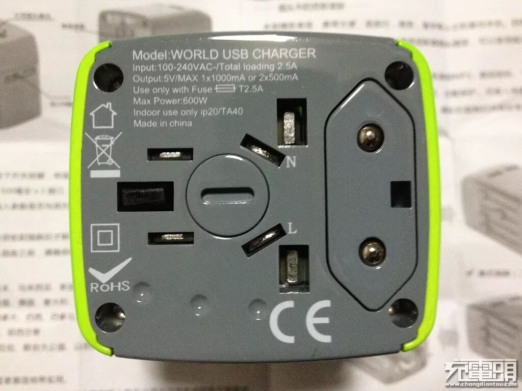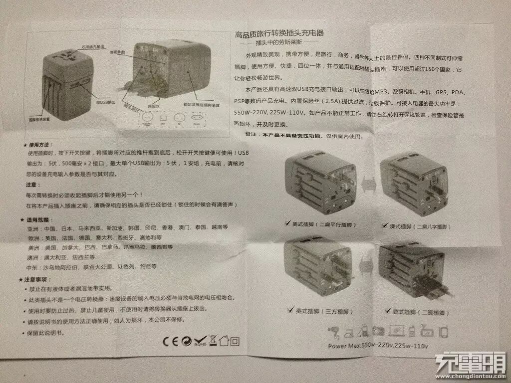 4、四种不同制式的可伸缩插脚,支持绝大多数国家的插座供电转换。