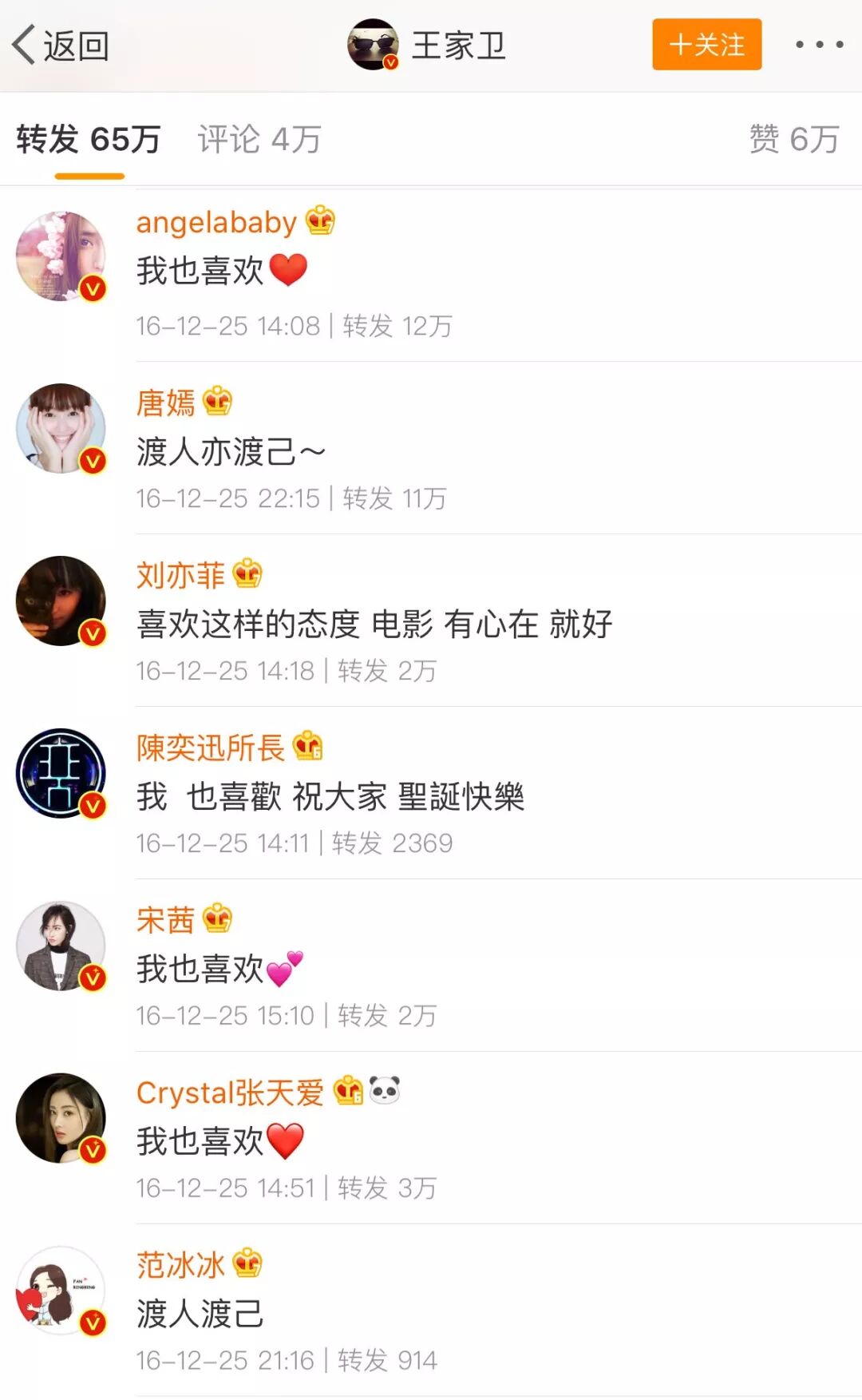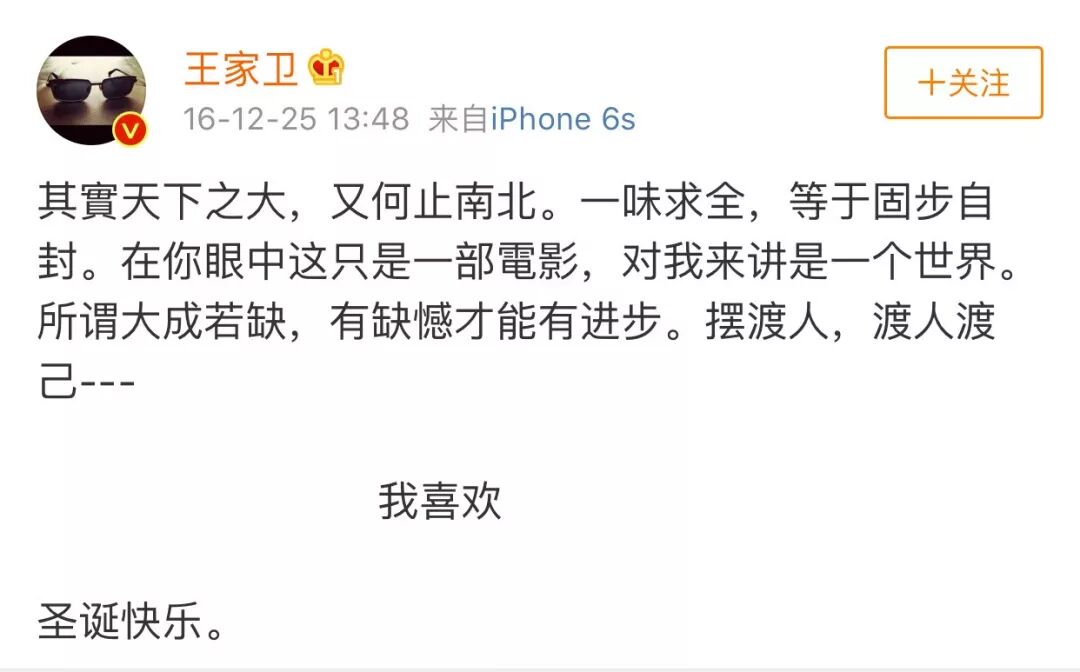 2016年《摆渡人》上映时,王家卫发力撑微博说“我喜欢”,引发半个娱乐圈的大咖们的转发表态热潮。