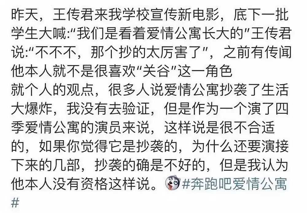 《爱情公寓》系列毕竟给了王传君最初的舞台和知名度,哪怕《爱情公寓》抄得无耻抄得彻底,diss的话好像也不该由他这个既得利益者来说。