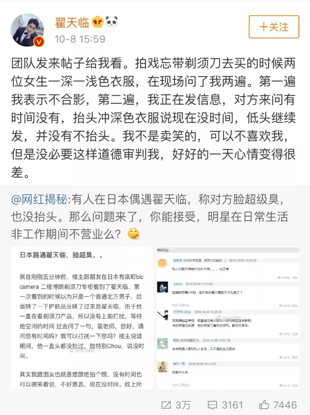 事情起因是一名八组鹅在八组发帖,说在日本偶遇翟天临