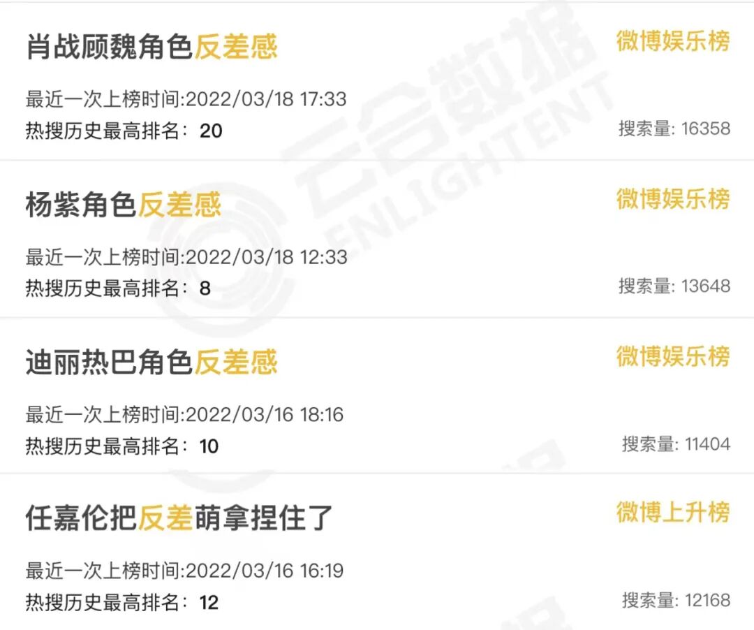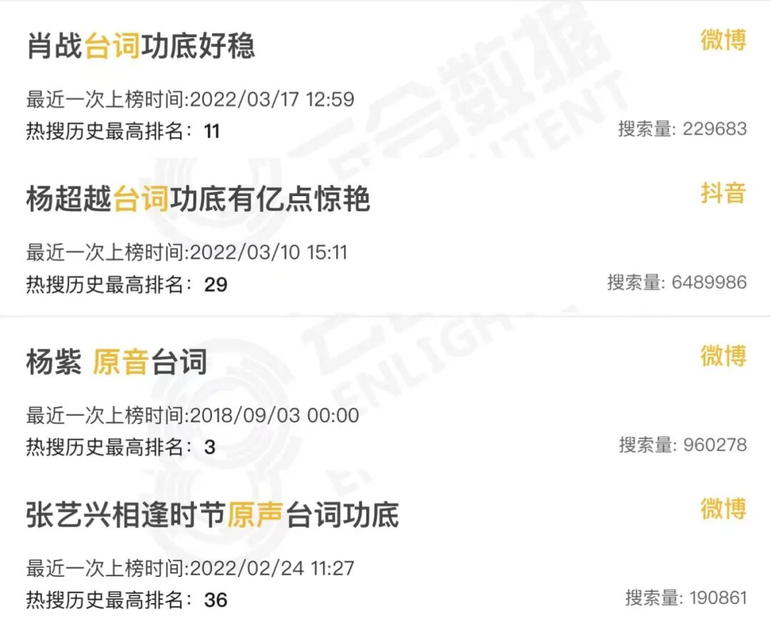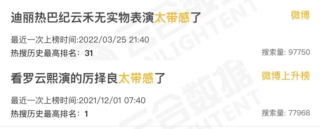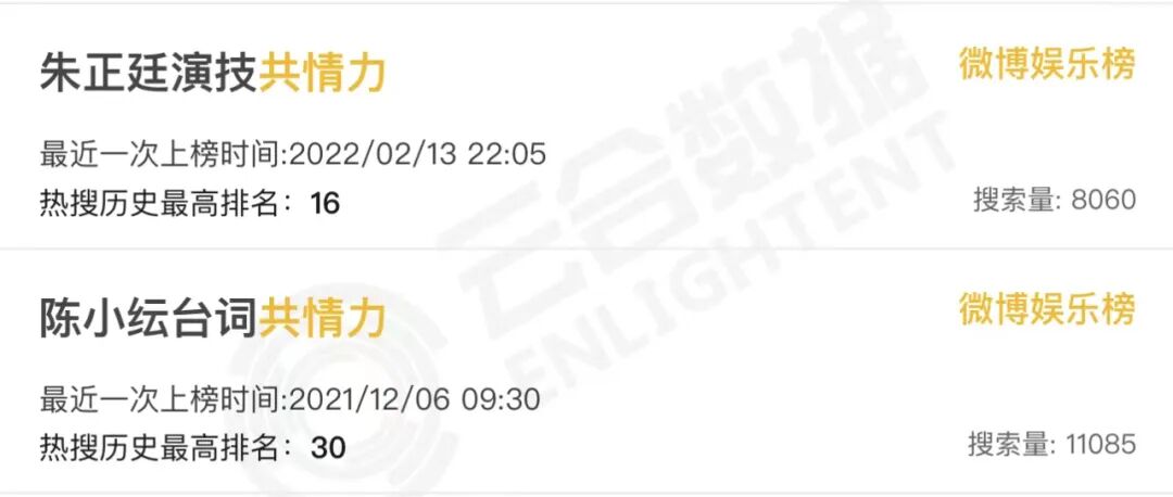而在剧方、平台方的利益层面,铺天盖地的信息量——甭管是情节、角色还是演技,一个又一个的热搜——甭管热搜词条下是真粉丝还是真水军,自然证明了剧集的热度、作品的成绩、投资的眼光、制片的胜利。而随着剧宣期和各种盘点季投放的一篇又一篇PR稿件,给自吹自擂套上花团锦簇的话术,各个都是内娱影视行业的扛鼎者。在演员层面,谁看了夸自己的话上了热搜,心里会不高兴呢?要是热搜词条下没有骂声就更好了——没关系,这不还有粉丝和乙方吗?有人会问,甭管演成什么样,都要以演技牛批为内核上热搜,明星自己心里没点数吗?害,这胆气是一天天被粉丝、数据平台和同行喂大的。一开始,他们用明星名+演技上热搜还战战兢兢,后来就要求花样翻新。别人能今天白切黑明天共情力后天哭不活了,我凭啥不能。而在乙方营销人员的层面,吆喝声足够大,总会有几个傻狍子walk in吧?但到底能不能吸引观众形成有效播放——唔,那关我宣传什么事?你要的热搜足额足量,你要的吹嘘感情充沛,你要的数据屡攀高峰,我的工作也就完美完成。粉丝得到成就感,演员得到赞美,出品方平台方得到热度,宣传方得到KPI,多么完美的结果啊。