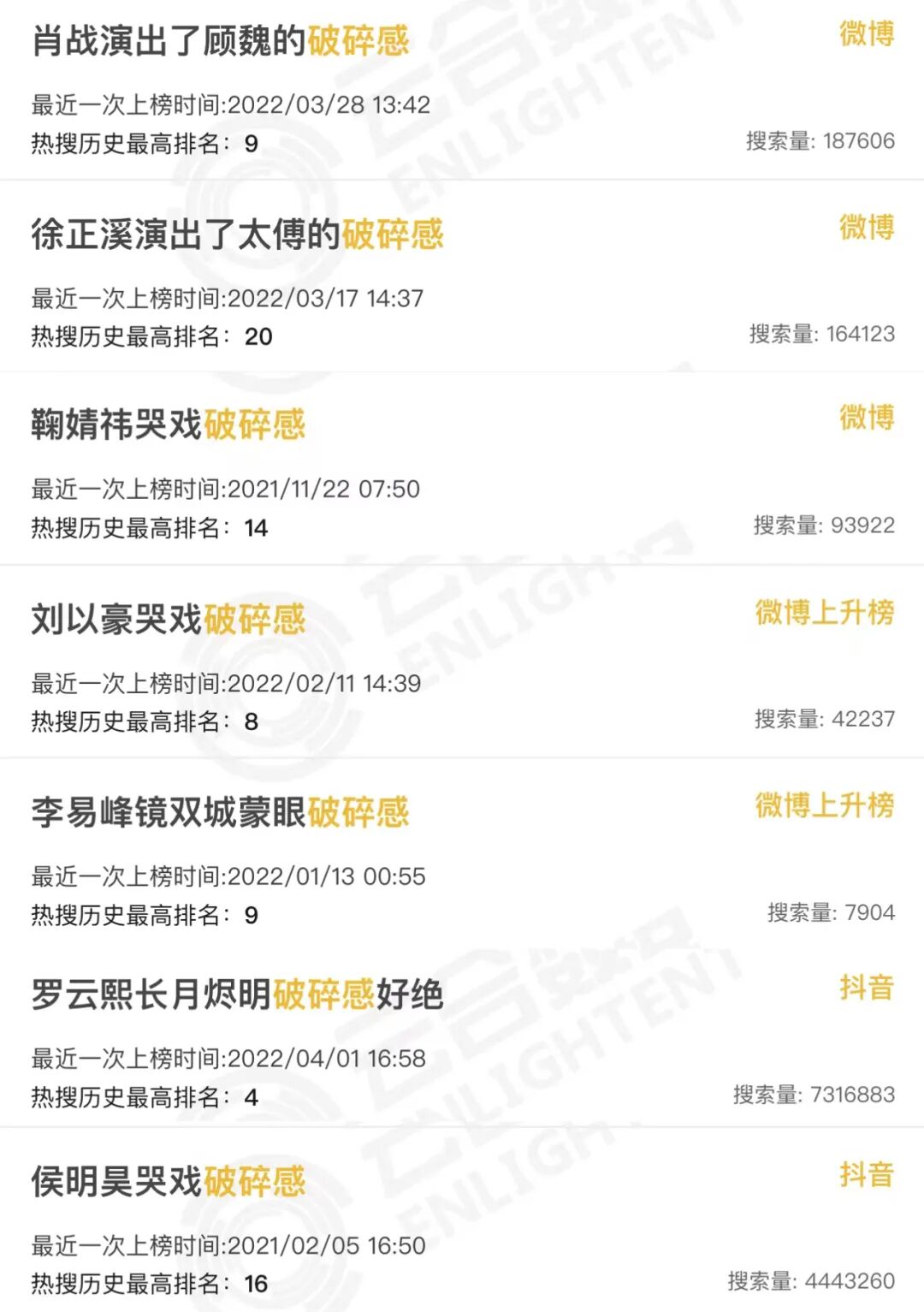 动不动还要来个破碎感——搞的热搜榜像一个大型碎尸犯罪现场,隔三差五就有一位明星为证演技惨遭“破碎”。![]()