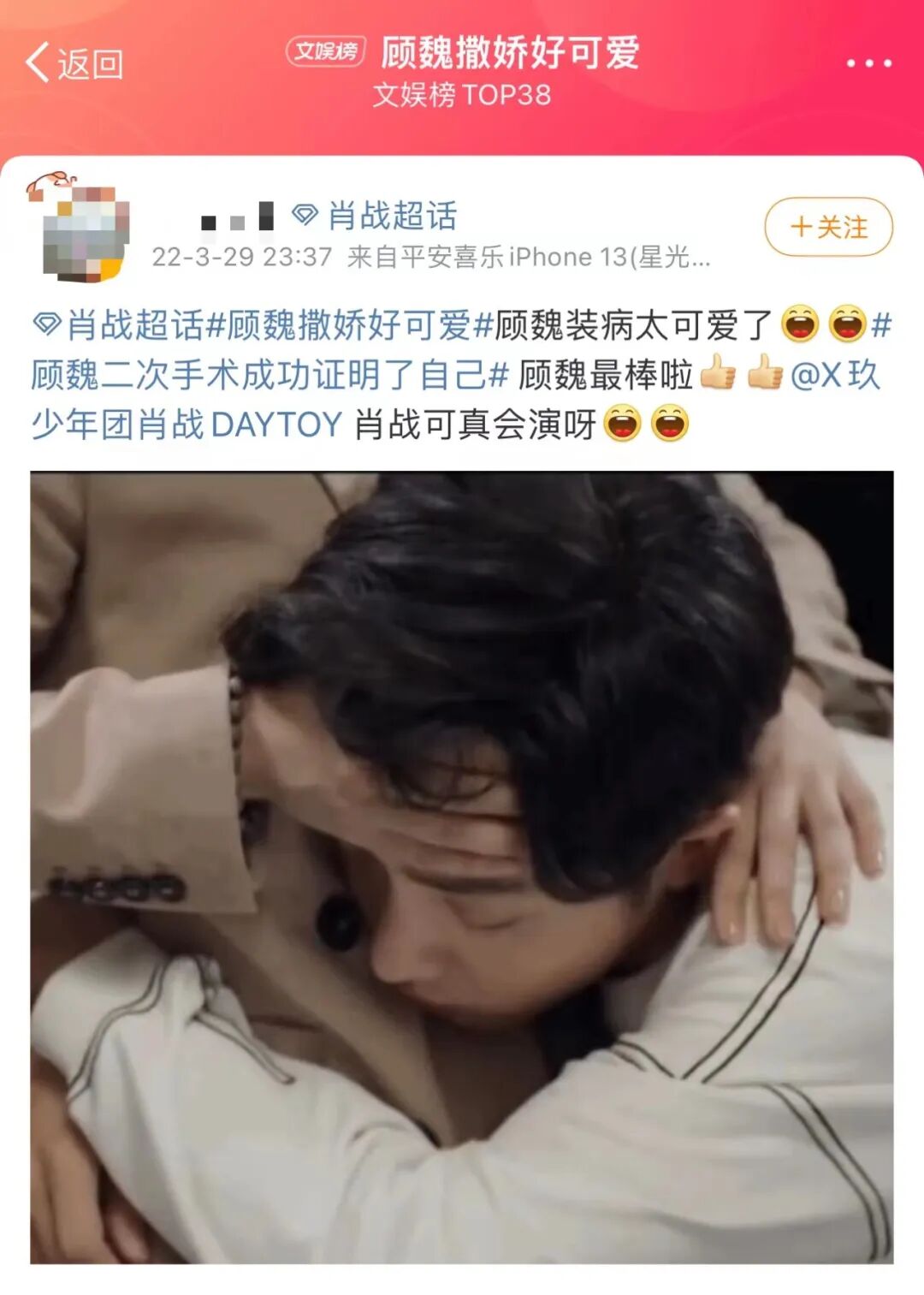 不慎点进去,你会看到所有文案除了口述一句狗屁不通的剧情,剩下的都是对偶像从头发丝儿到脚后跟的花样彩虹屁,粉圈常规操作,当然。结尾加一句“被可爱\虐\笑到了,哥哥好会演啊”,就万事大吉。![]()