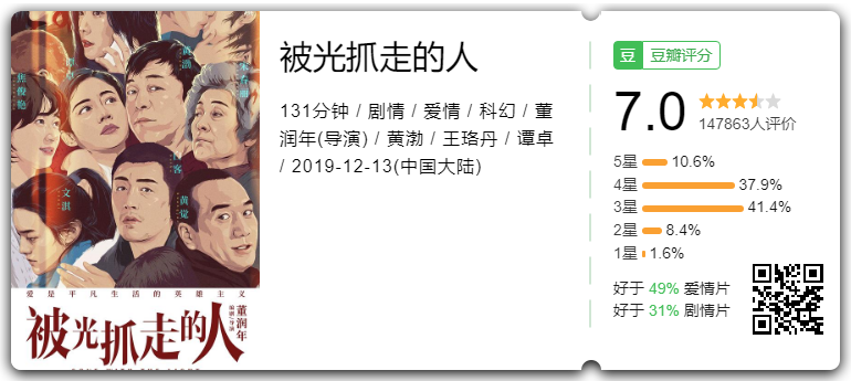 豆瓣起家于书影音评分系统,原本“影”只含电影,是豆瓣过往偏精英化品味的集中体现。老豆瓣用户有看完电影顺手去豆瓣上打个分的习惯,所以票房再普通的电影,在豆瓣上评分的人数也并不低。比如这部票房只有7000万、口碑算不上多好的《被光抓走的人》,其评分人数超过14万。这个评分人数,比今年收视率最高、话题度也不低的剧集《安家》还要多一些。看过《安家》的人,一定比看过《光抓》的人多,但“用打分来标记自己看过”这个动作,从豆瓣固有用户的习惯来说,电影是远远高于剧集的。