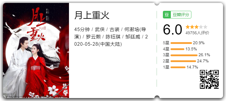 《枕上书》在打分人数远远高过的情况下,豆瓣分还高于《十里桃花》。所以真的是《枕上书》妥妥更好看?只是因为《枕上书》播出在控分更容易的今年吧。6分这一档的谍战剧,可能是“不精彩但勉强看得过去”。更别说那些“牢牢挂在及格分上想证明自己合格但它都能及格简直没天理”的剧集,比如《月上重火》:一定要说它们的水准已经及格了,那《扶摇》就落下泪来。
