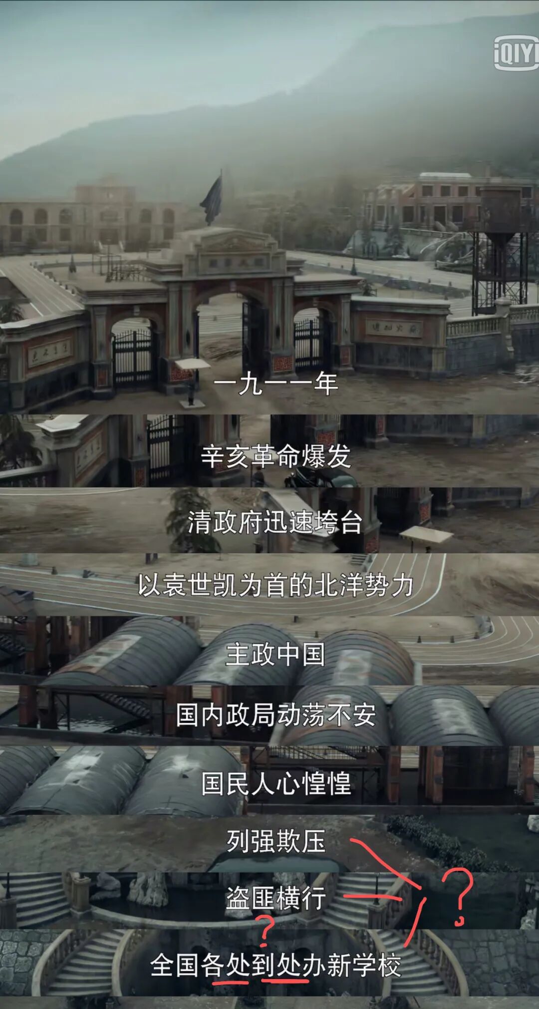 这回呢,画外音是想强调辛亥革命后中国的时局震荡、民不聊生:最刺眼的当属“全国各处到处兴办新学校”了,“各处”“到处”放一起用,小学生都不会犯的语病错误,全剧组上下这么多人愣是挑不出来吗?但你再仔细品品前后文,为啥“兴办新学校”要和“列强欺压”、“盗匪横行”并列啊?“兴办新学校”也是社会一害?跟列强和盗匪是同一个性质的社会顽疾?这么仇恨教育吗?难怪文化水平不高……当然啦,你大可以宽厚地认为,“兴办新学校”是前面那些现象的结果,它只是忘了加副词…………那再往下听: